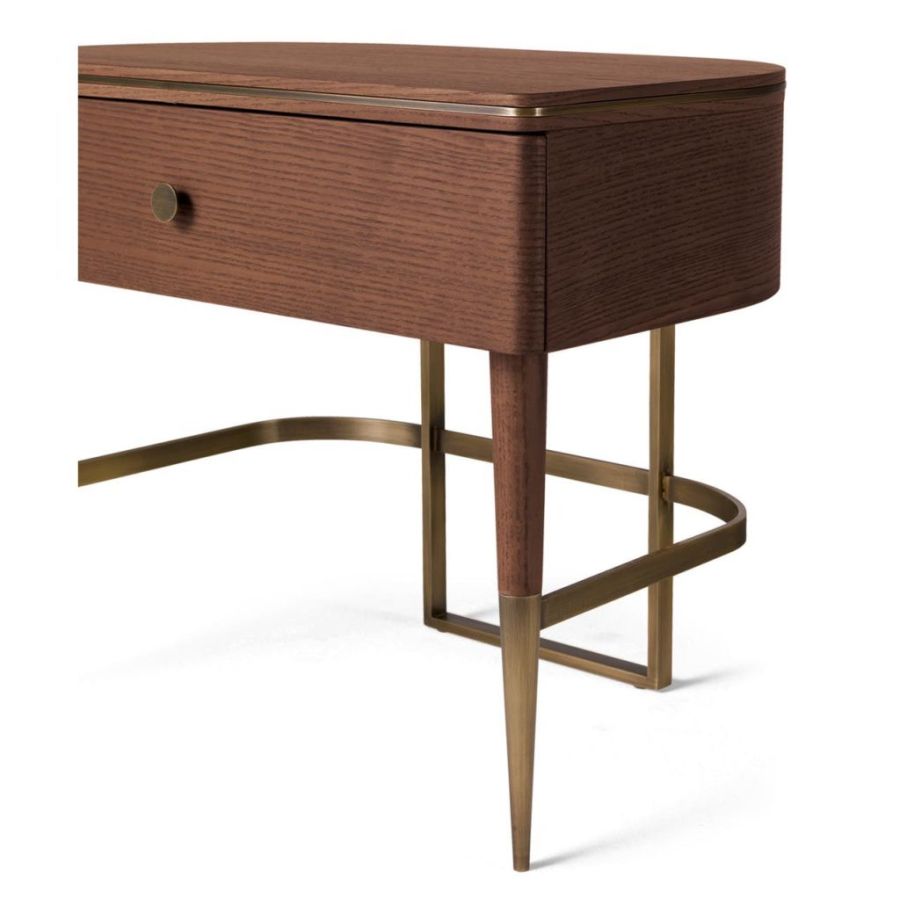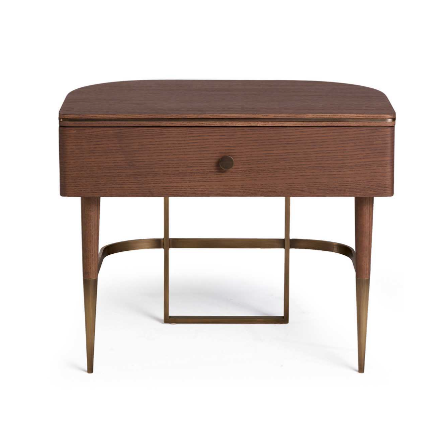 Modern bedside table in smoke-stained ash with a sophisticated design. The lightness of the structure decisively expresses the elegance and sobriety of the entire ATELIER line. Its structure is composed of a large suspended drawer and elegant details in bronzed metal.