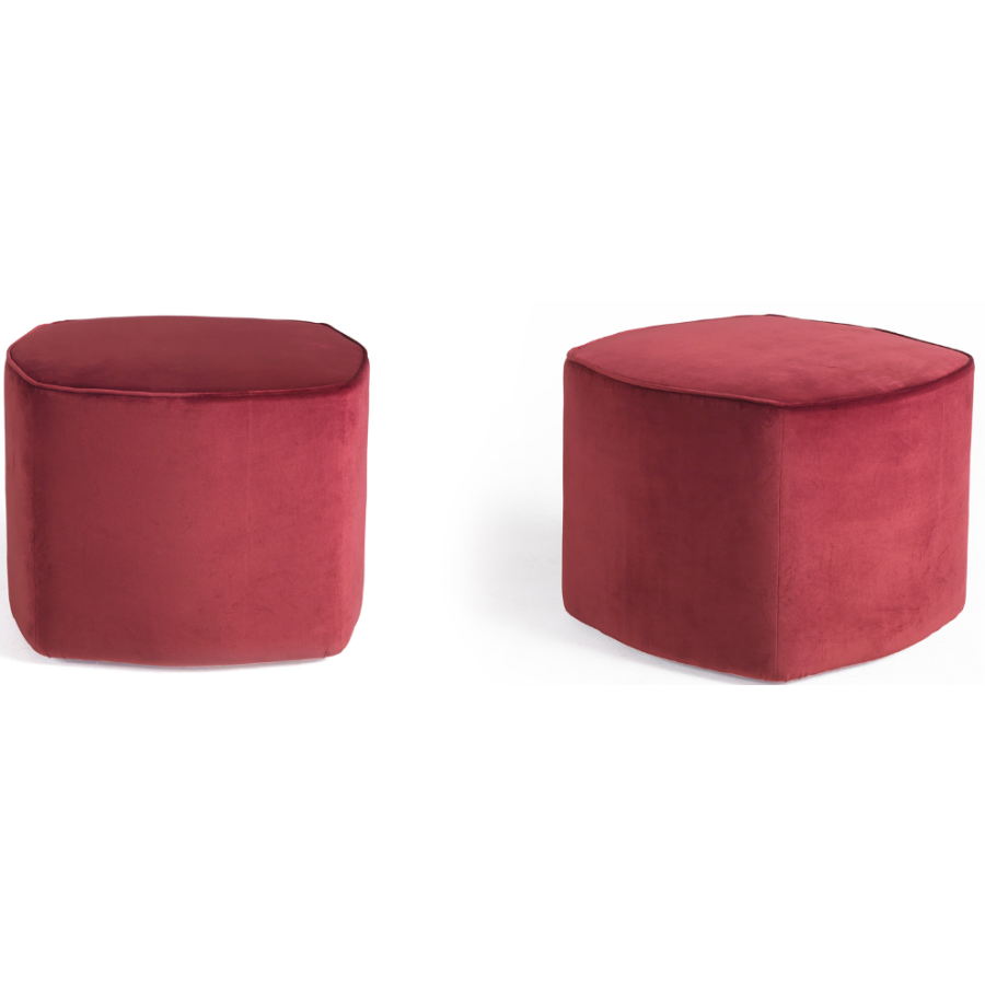Impeccably comfortable, this elegant modern ottoman wrapped in a chic red fabric can be used as an extra seat or footrest in a modern living room or office decor.