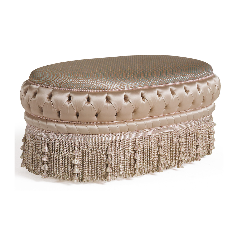 Elegant capitonné pouf with fringes. Its comfortable appearance and the width of its seat guarantee comfort and adaptability to different environments. The RODOLFO pouf can be used as an extra seat or to meet any need for layout and intended use.