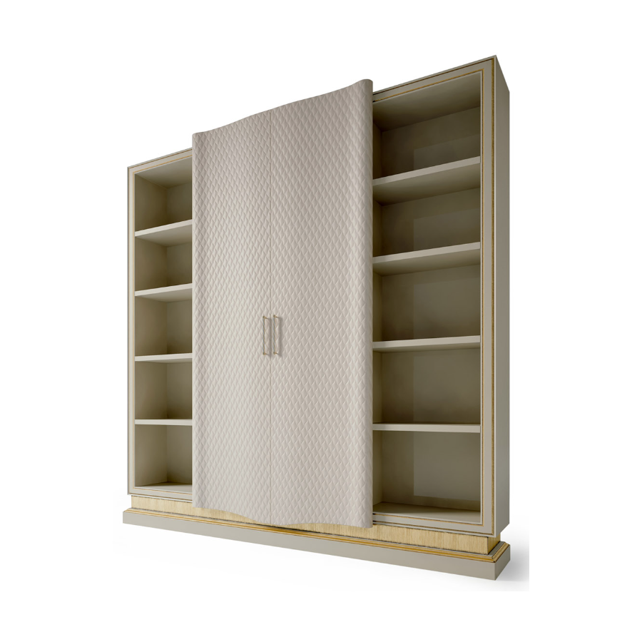 Elegant bookcase with a unique and contemporary style composed of large open compartments and two elegant doors covered in embroidered leather.