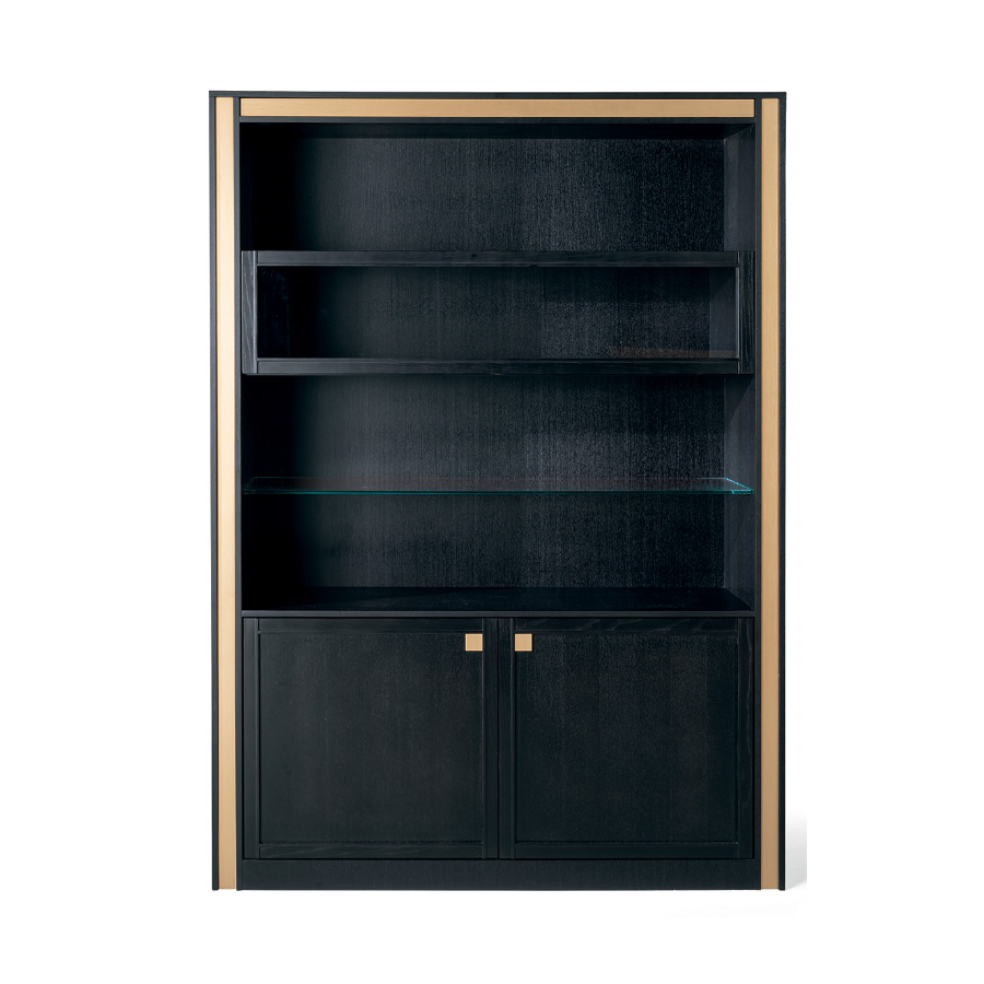 DOWNTOWN is a contemporary style bookcase in black stained ash with brass details and champagne finish. The piece of furniture is made up of four open shelves and two large compartments with closed doors. DOWNTOWN is a practical and comfortable complement that adapts to environments with elegance and simplicity.
