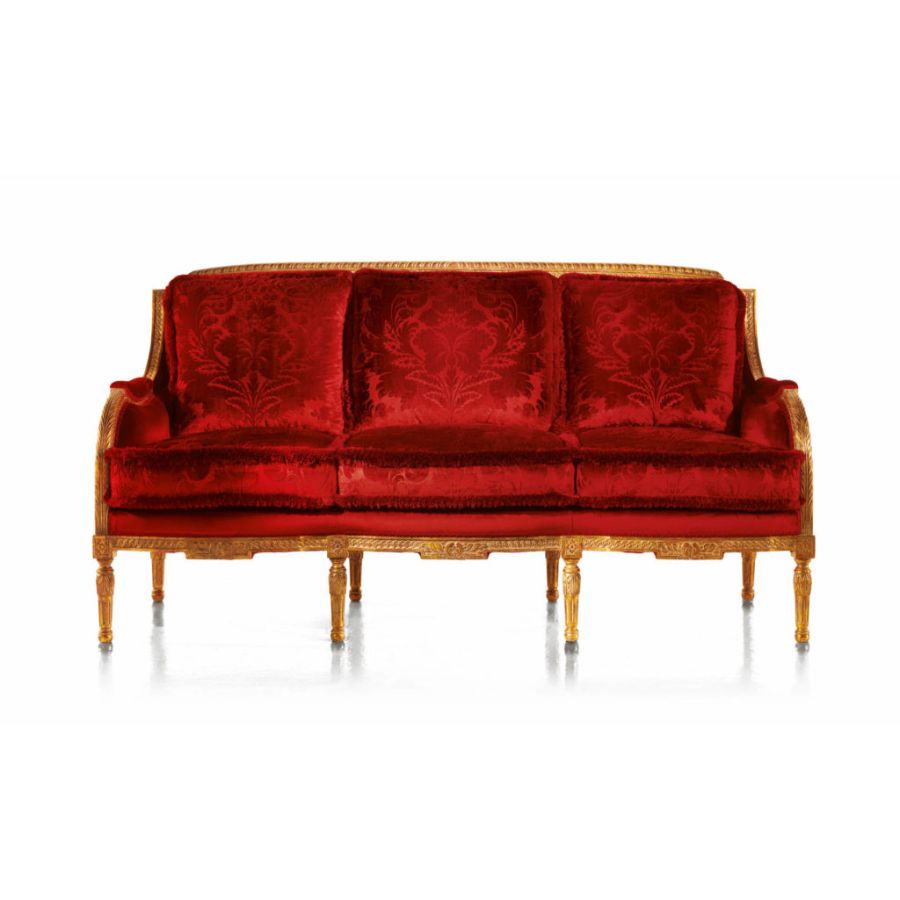 Classic sofa with sophisticated carved structure with gold leaf finish. Its handcrafted workmanship according to the Brianza tradition makes this set of seats unique and exclusive works, timeless protagonists of a luxurious and refined elegance, the result of the skilled work of master craftsmen who pass down the secrets of artisanal workmanship from generation to generation.