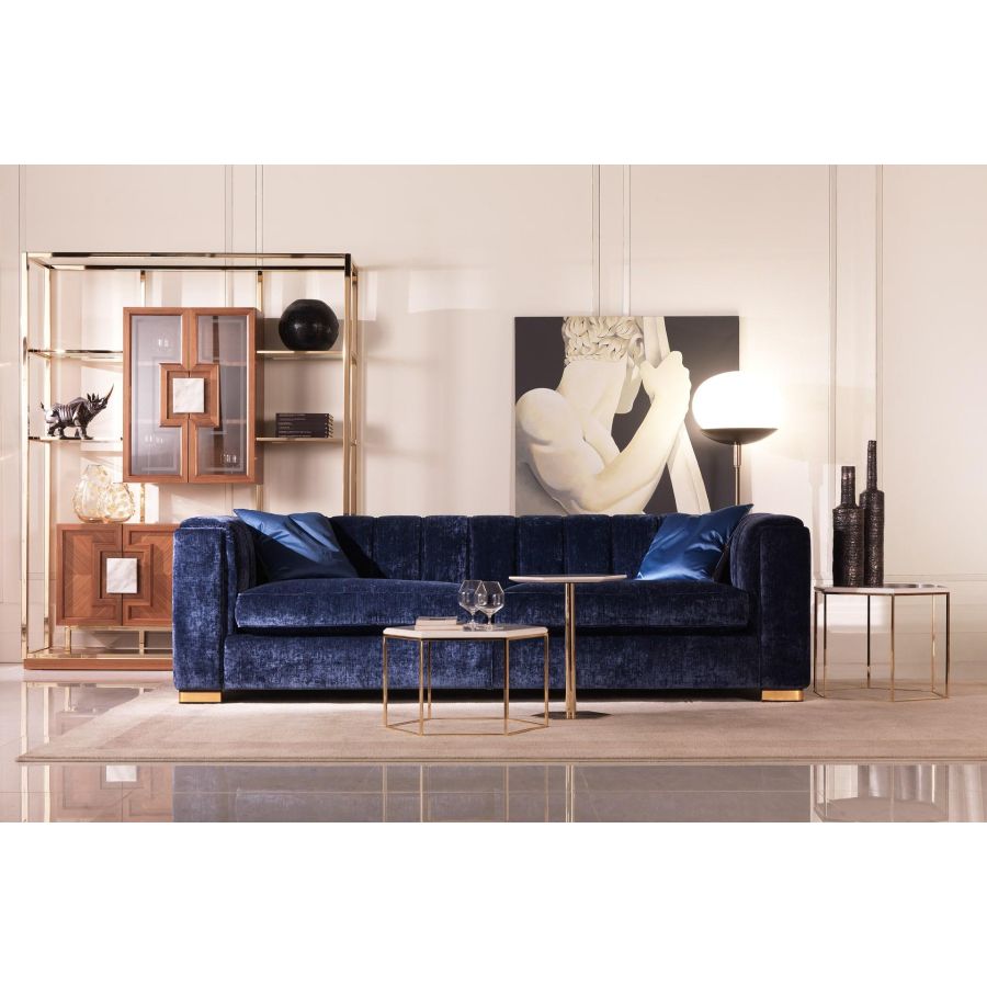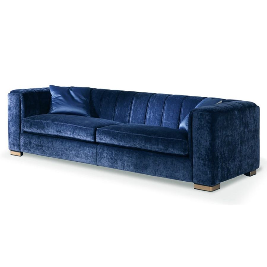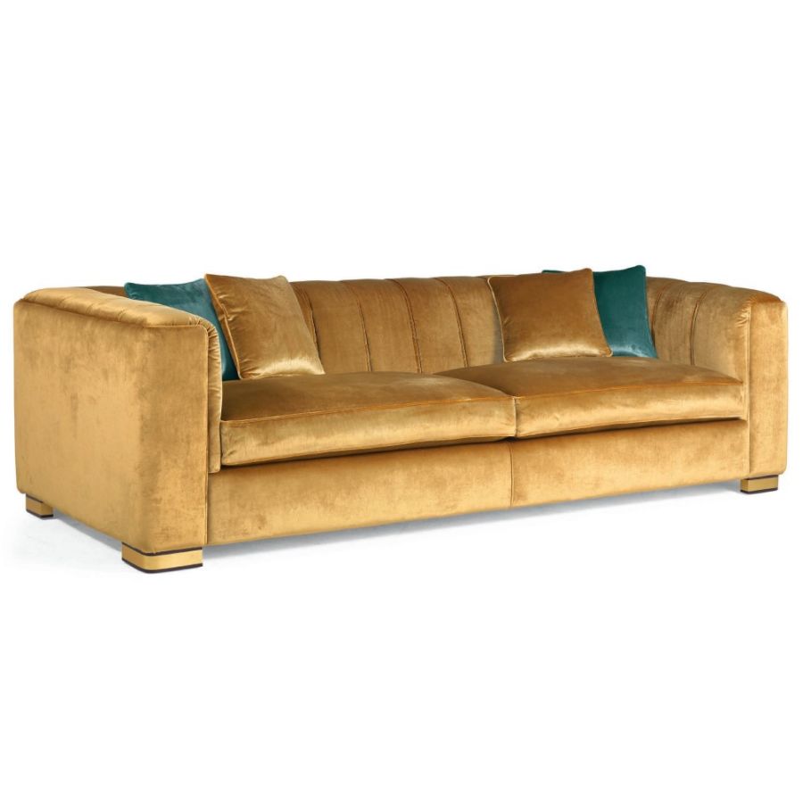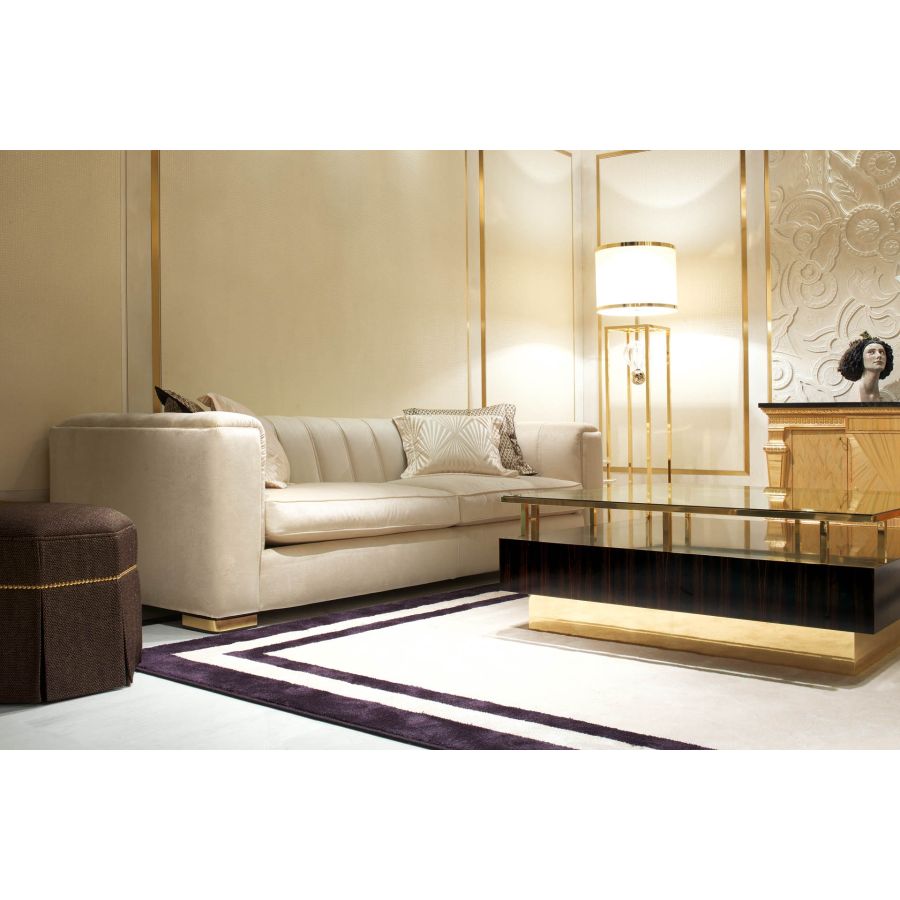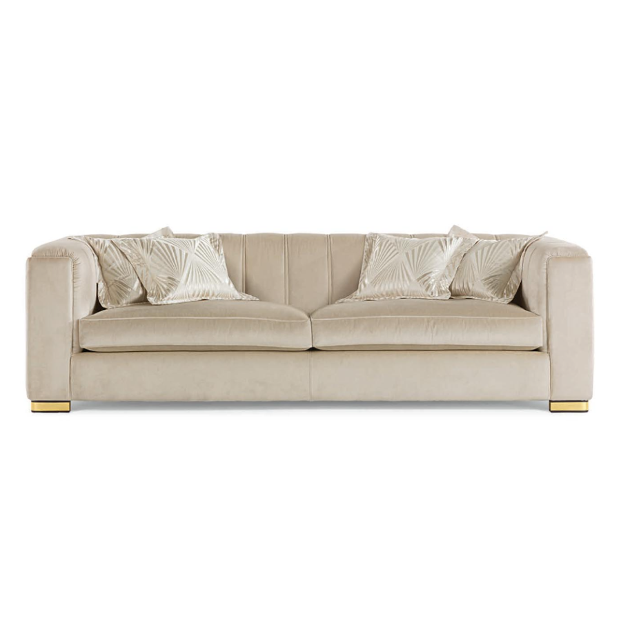 Sofa with a linear and elegant design, an icon of the contemporary collection, embellished by the handcrafted embroidery on the backrest and by the fine materials.