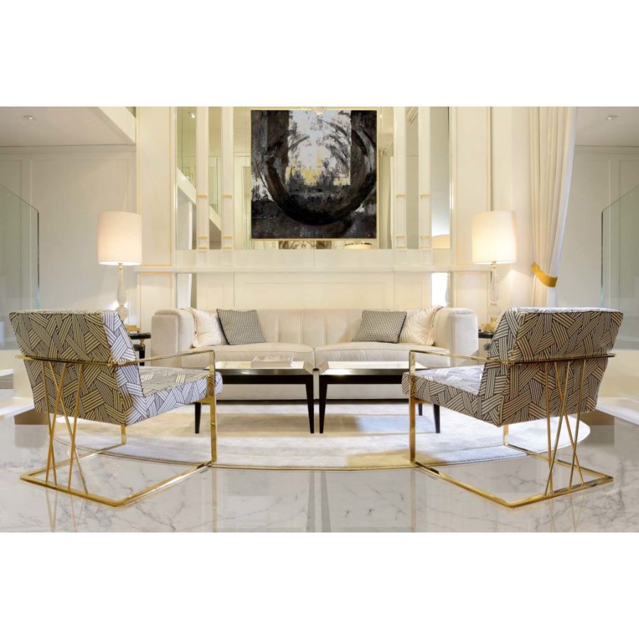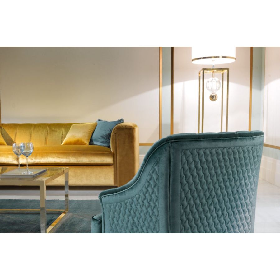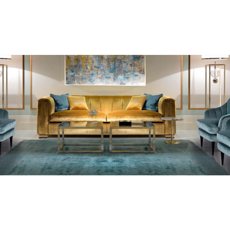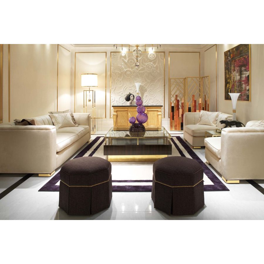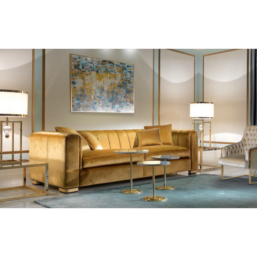 Sofa with a linear and elegant design, an icon of the contemporary collection, embellished by the handcrafted embroidery on the backrest and by the fine materials.