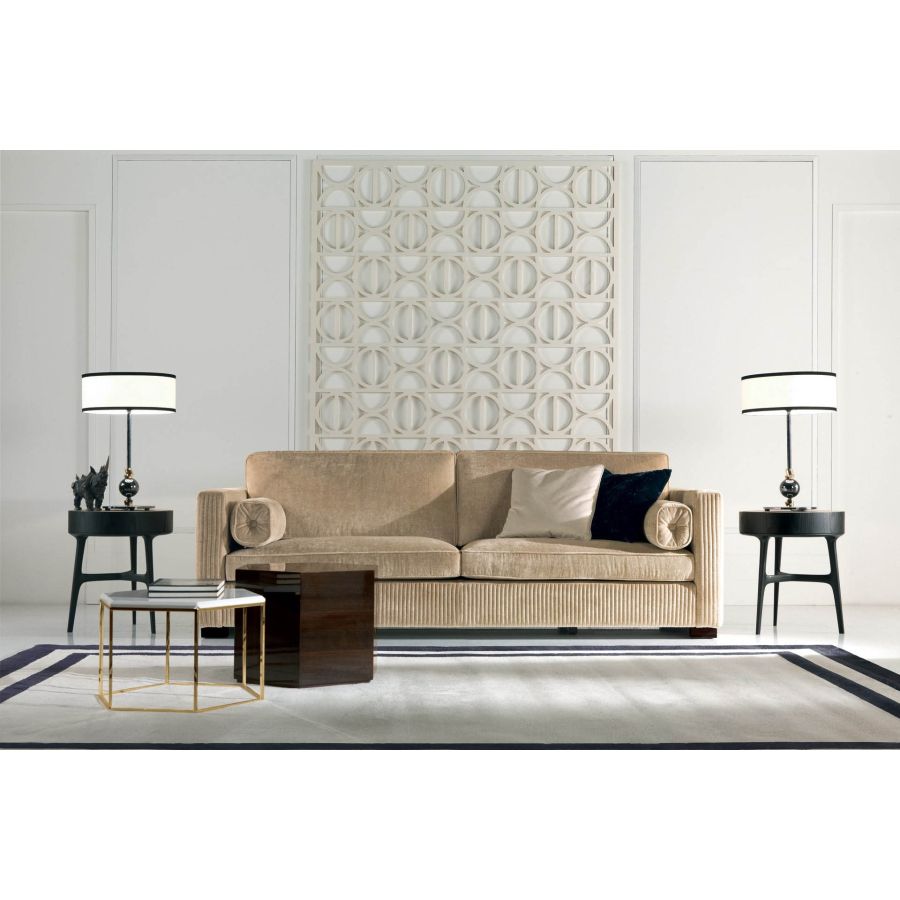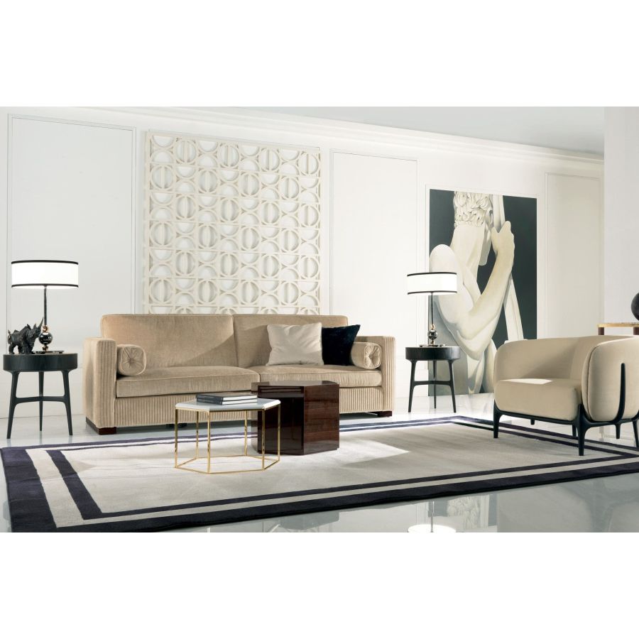 Sofa with black stained wooden base with a sophisticated and elegant design, an icon of the contemporary collection, embellished by the handcrafted embroidery on the entire structure. Available in the 3-seater, 2-seater and armchair versions with its characteristic decorative cushions.
