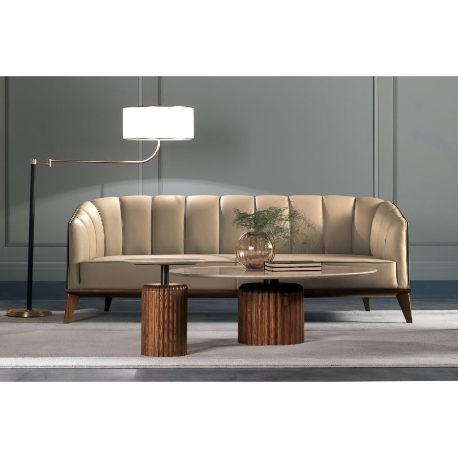 Elegant living room in modern style composed of a three-seater sofa , a two-seater sofa and an armchair . ROY is born from a reinterpretation of the traditional sofa reinterpreted with sculptural reminiscences, the balance between the rigid structure and the volume of the padding gives life to a set of seats with a soft and enveloping aesthetic.