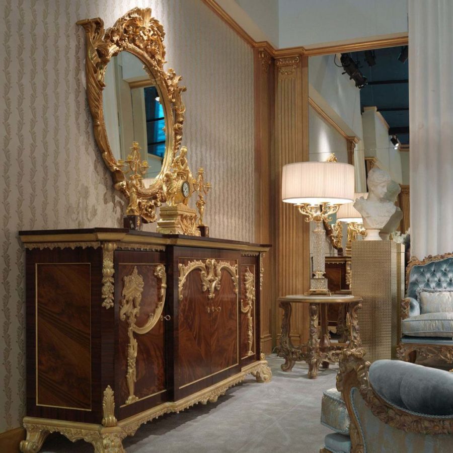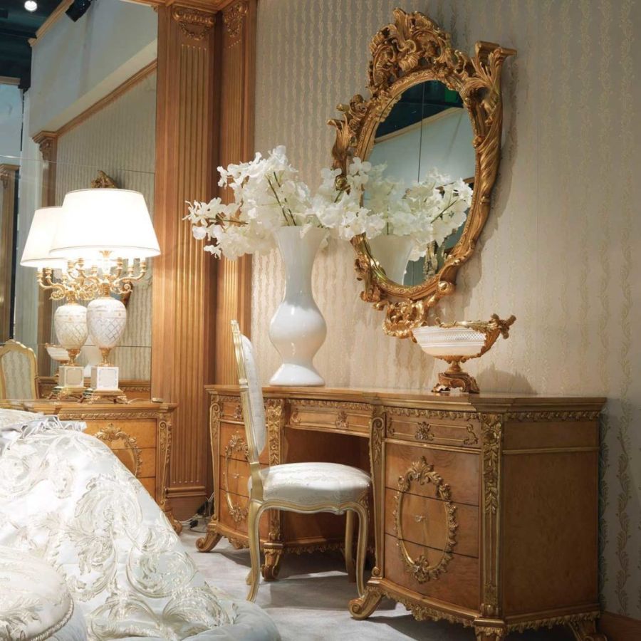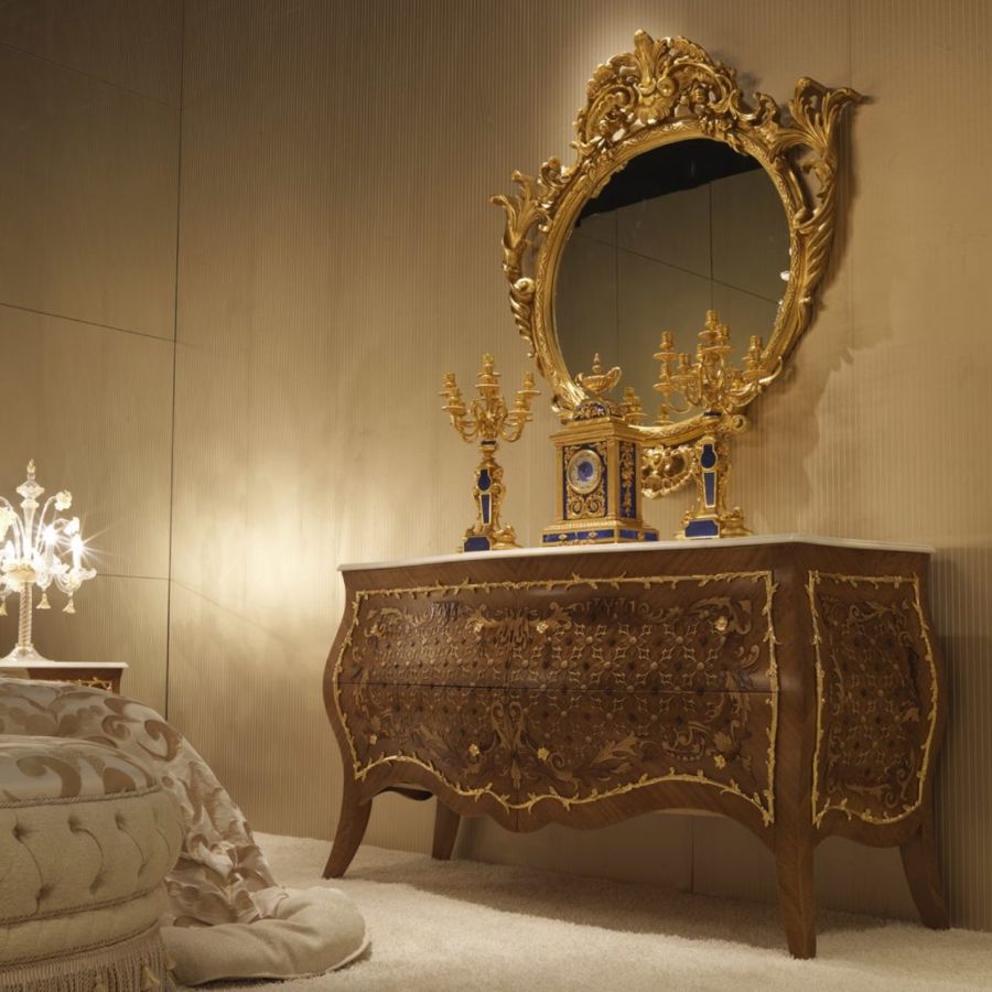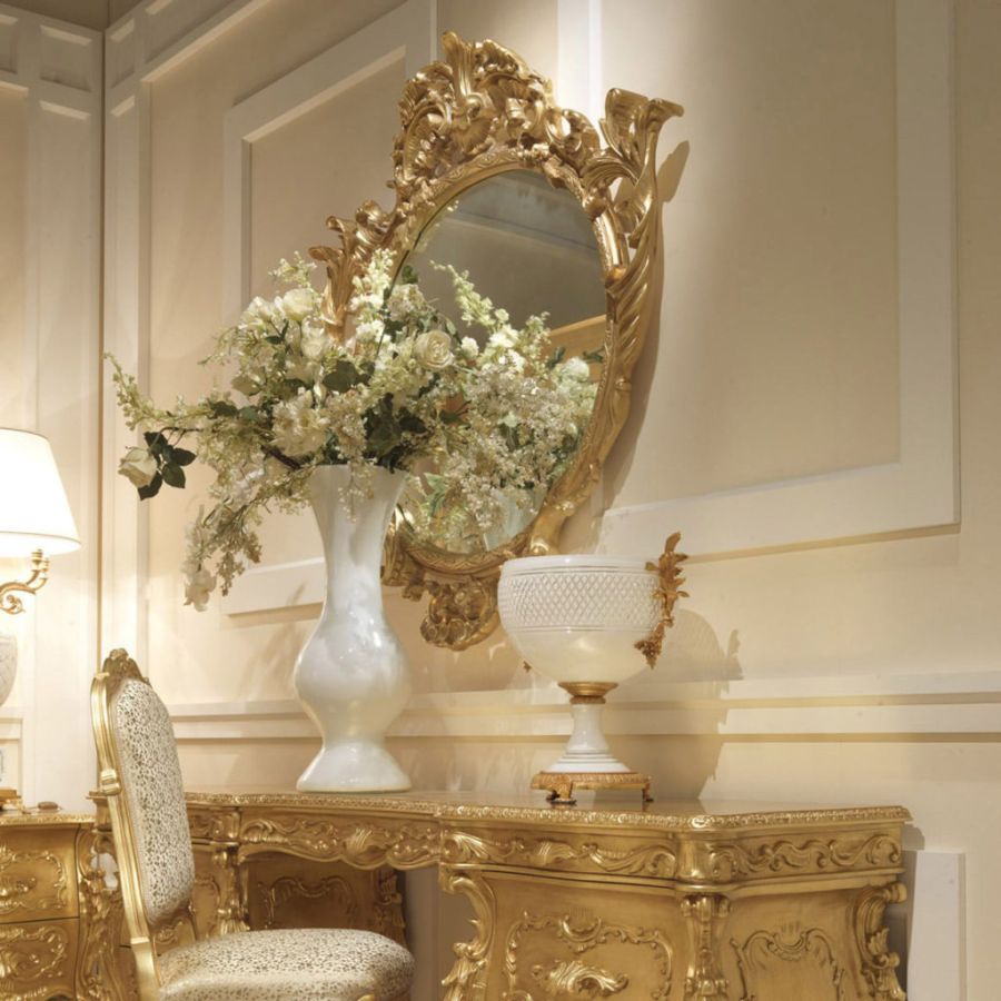 Sophisticated mirror with antique gold frame finely carved according to the Brianza tradition. To create a dressing table in grand style, ZANABONI proposes the T109 mirror together with the W055/DR Dressing.