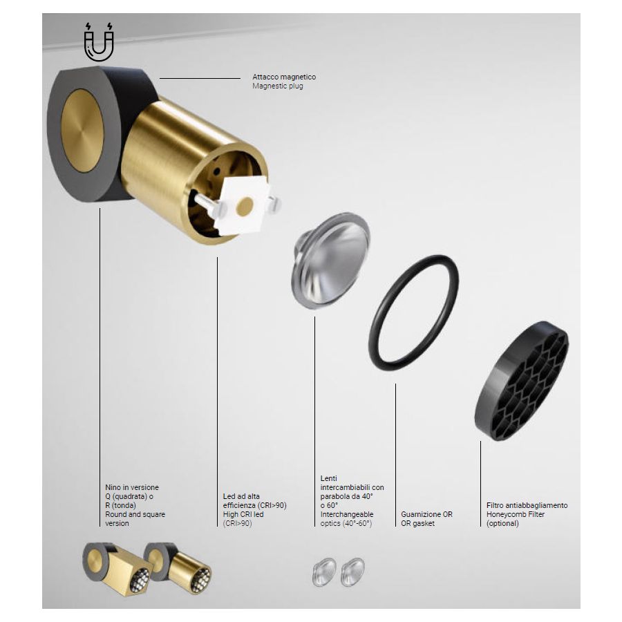 Låt dig inte luras av dess storlek - Nino är ett verkligt mästerverk av design och teknik, som sömlöst förenar kraft och elegans i en anmärkningsvärt kompakt form. Designad av Franco Zavarise, förkroppsligar den här strålkastaren renheten i geometriska former, där cirkeln och kvadraten möts i en harmonisk balans. Med sin minimalistiska estetik och precisionskonstruktion är Nino mer än bara en belysningsarmatur - det är en iögonfallande detalj.