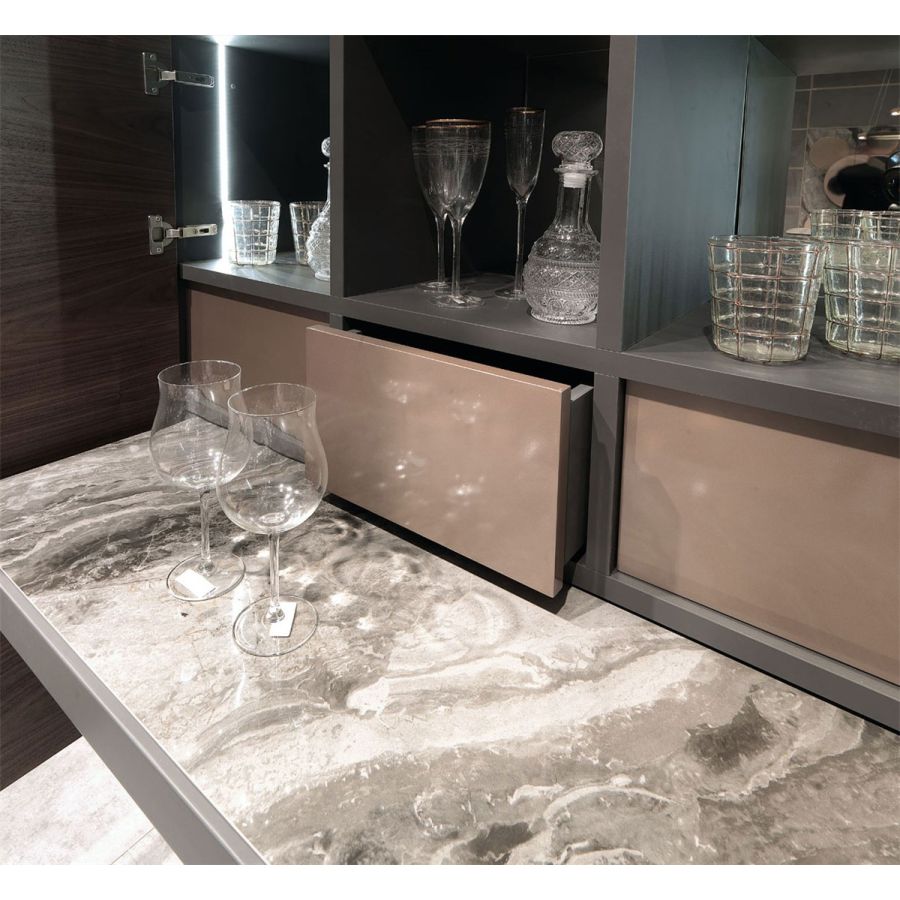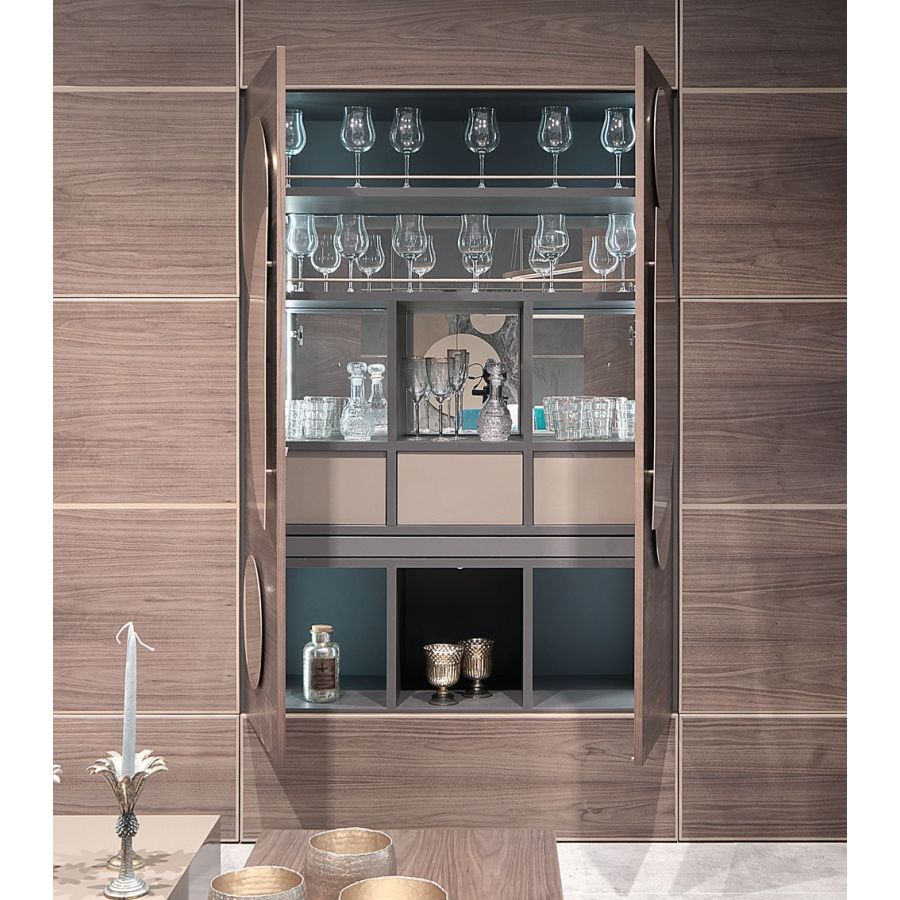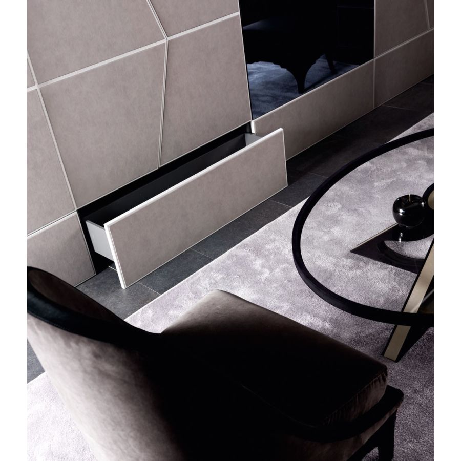 Storage units structure in white or anthracite decor chipboard. Metal frame for doors and drawers in decorated iron, polished steel, brushed steel, nikel or gold nickeled finishing. Doors and drawers fronts in poplar blockboard veneered in sand blasted oak, Canaletto walnut, mdf, or covered with leather, eco-leather, mirror. Tempered extra-clear, smoked or bronzed glass doors th.6 mm. Birch multilayer internal drawer with soft-closing metal rails. Adaptable aluminum feet.