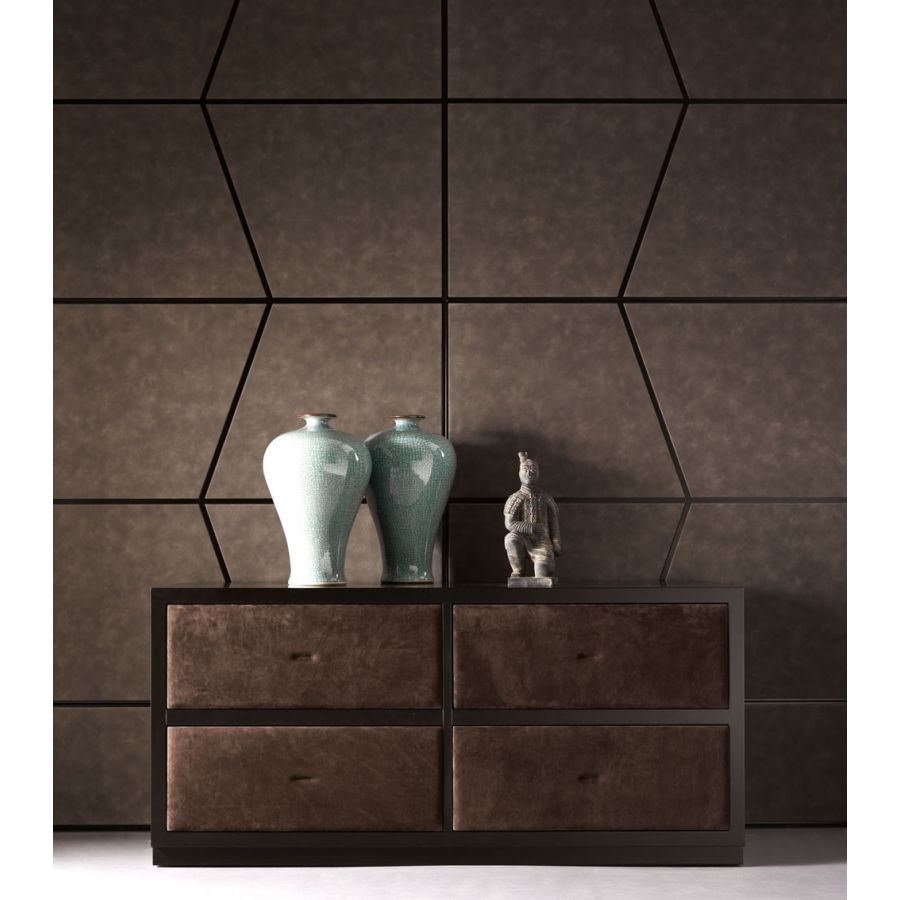 Zenit wall panels allows to create elegant decorative walls to be integrated with the modular storage units of the Zenit wall units program. Panels are made of wood and are rounded-off with metal frames. Panels and metal frames can be finished in all the proposal of the wide sample set, can be upholstered in leather or eco-leather or veneered in Canaletto walnut or sand blasted oak. The program can also accept some other material on the choice of the architect.