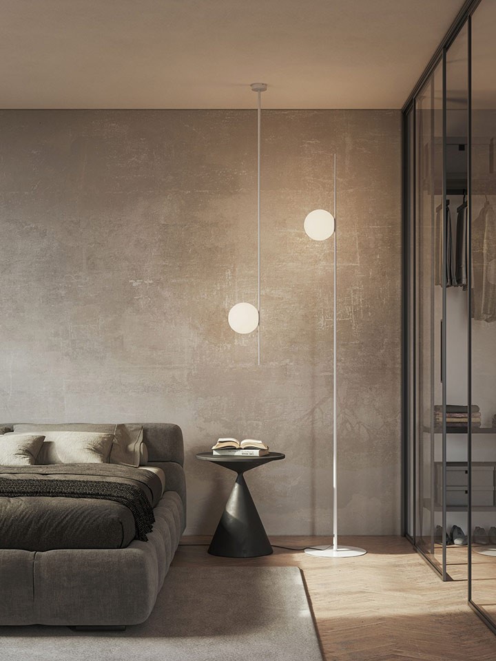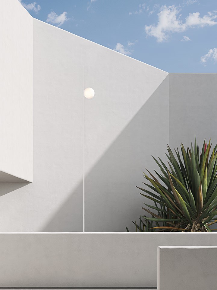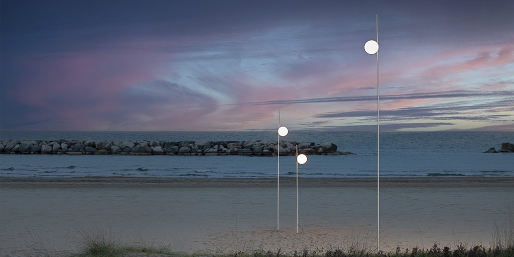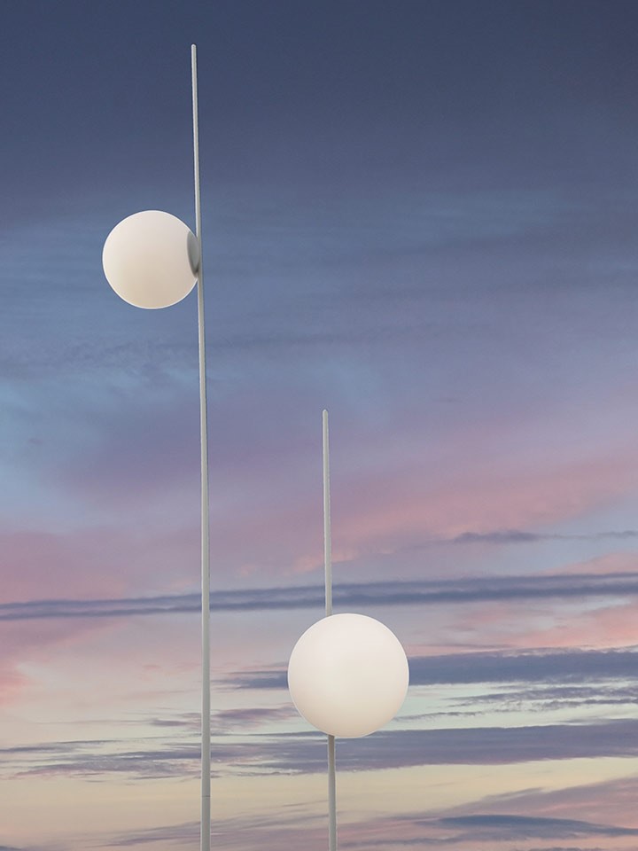 A blade of grass with a drop of dew on it and a perfectly balanced reflective sphere above it. Atmosphere is a simple, minimal lamp that can combine aesthetic and decorative value with functional value, indoor or outdoor, with a soft, enveloping light.