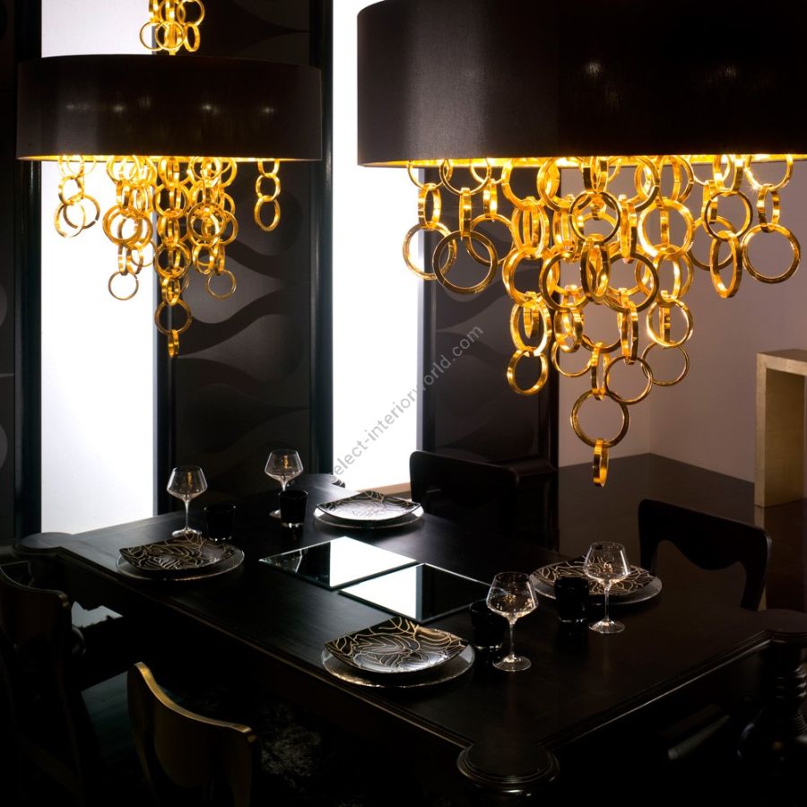 The chandelier is formed by a brass structure with a light burnished workmanship embellished with chains of rings in ground iron and welded together in an accurate way thanks to the special skill of our master craftsman and then gilded. The rings make this chandelier unique and particular so as to be suitable for both classic and contemporary environments adorning both living areas and bedrooms. The circular lampshade in the finest Chintz black with gold foil interior handmade to measure. The circumference of the lampshade is 80x24,5h but on request can be modified as well as the length of the chains of rings so as to adapt to the environment in which it will go.