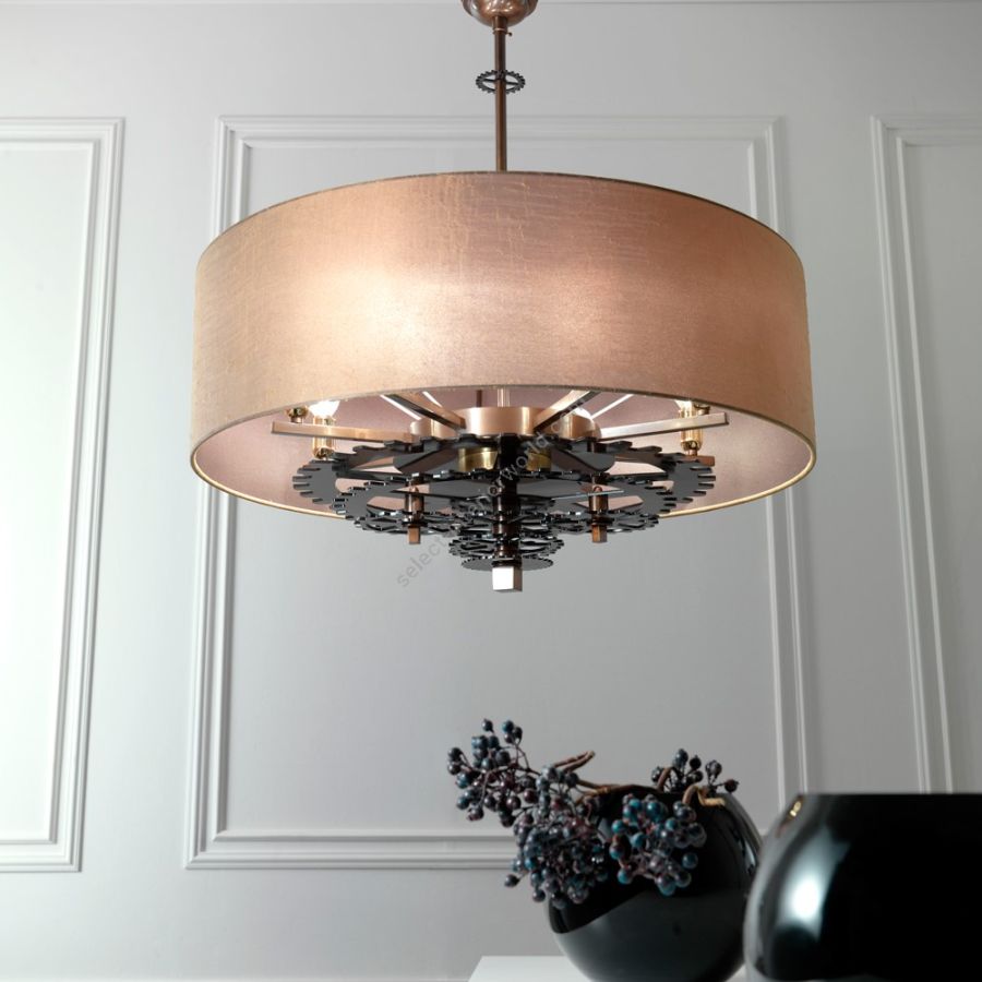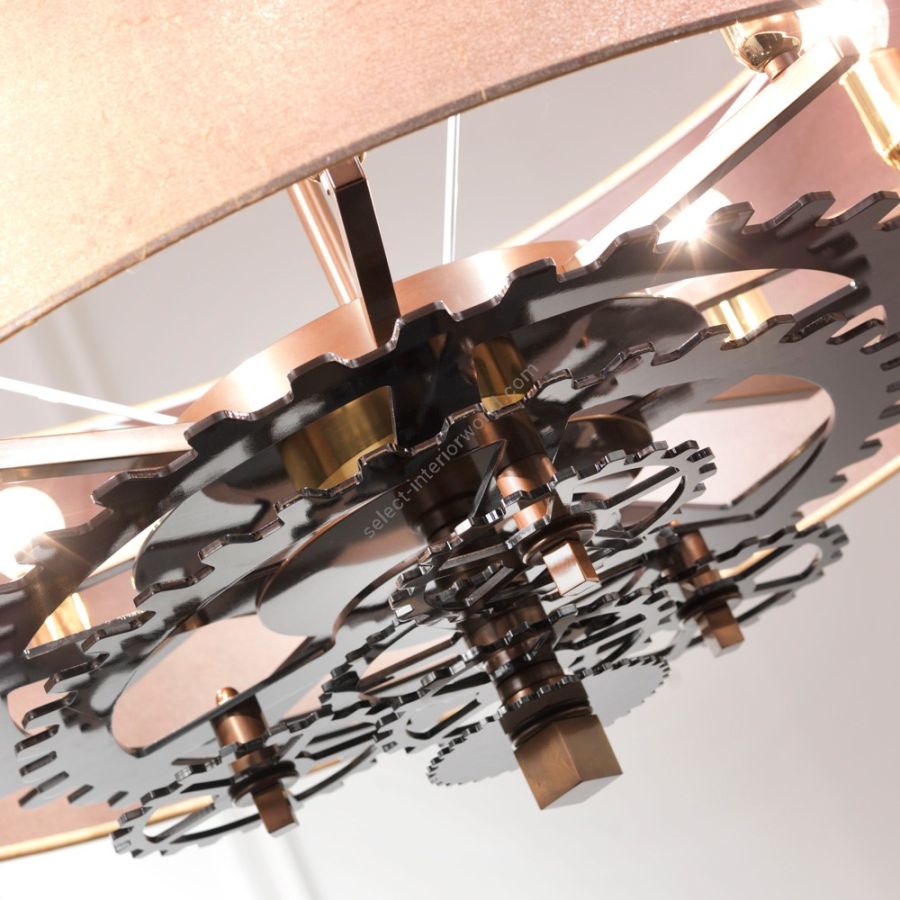 Chandelier with burnished iron structure and iron gearwheels, pewter finish. Gold “lux” silk over brown silk double lampshade.