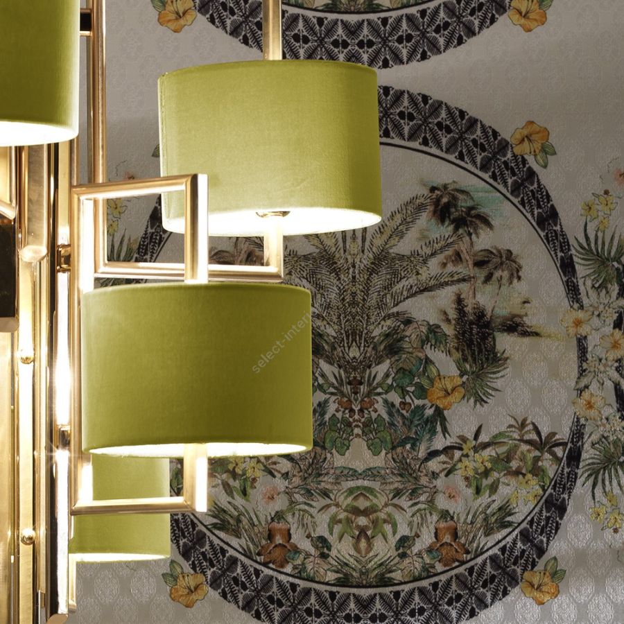 Brass chandelier with satin and shiny golden finish. Velvet lampshades, also available in silk.