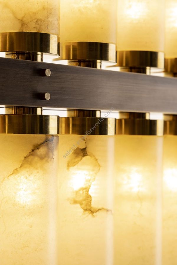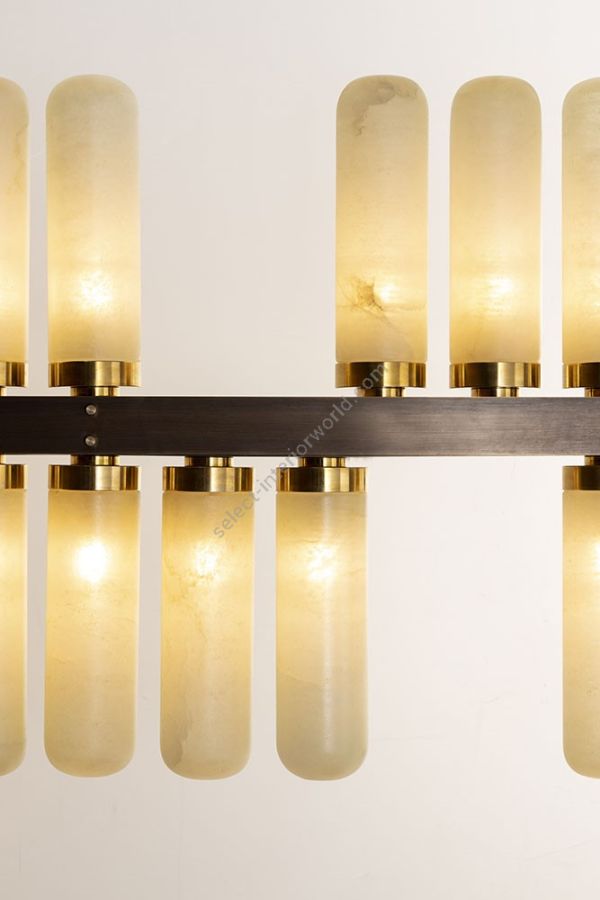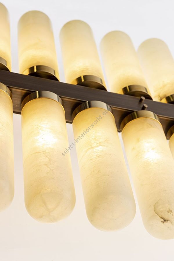 Chandelier horizontal shape in burnished brass and details in natural brass with alabaster