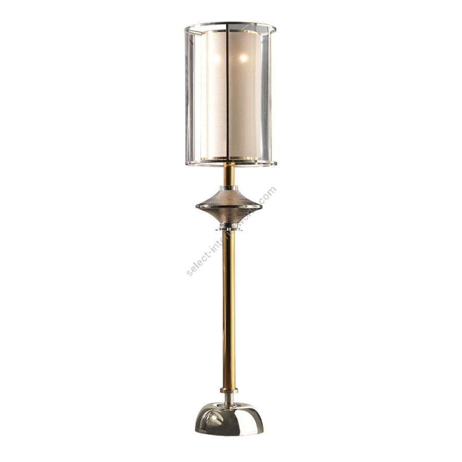 A very special floor lamp composed of a central part in majolica engraved by hand and platinum plated, the whole structure is in gilded brass and nickel with plexiglass inserts turned by hand. The lampshade that is the most particular part of this lamp is composed of an outer lampshade in nickel brass with plexiglas plates and the inner lampshade is in gold lamé fabric. Modern taste but it’s also placed in classic environments.