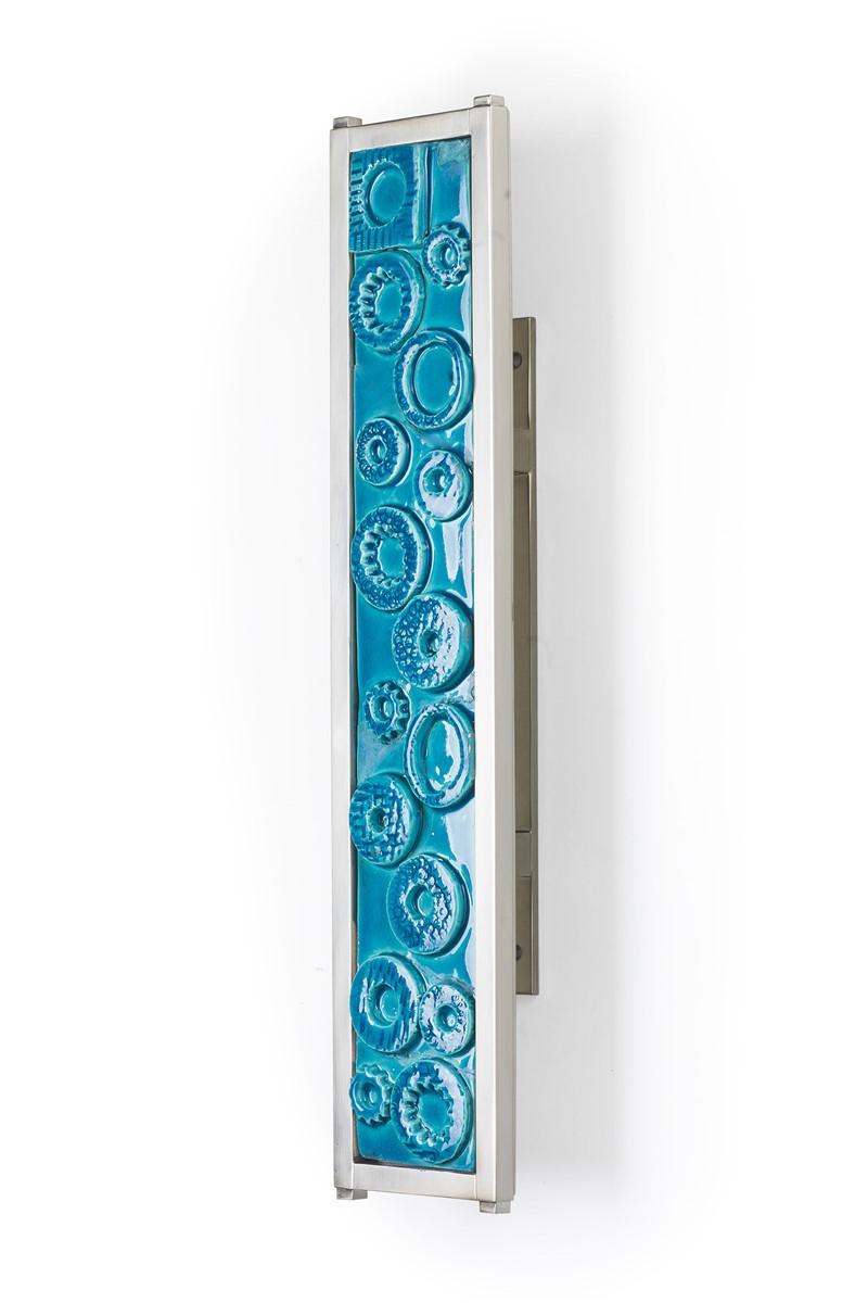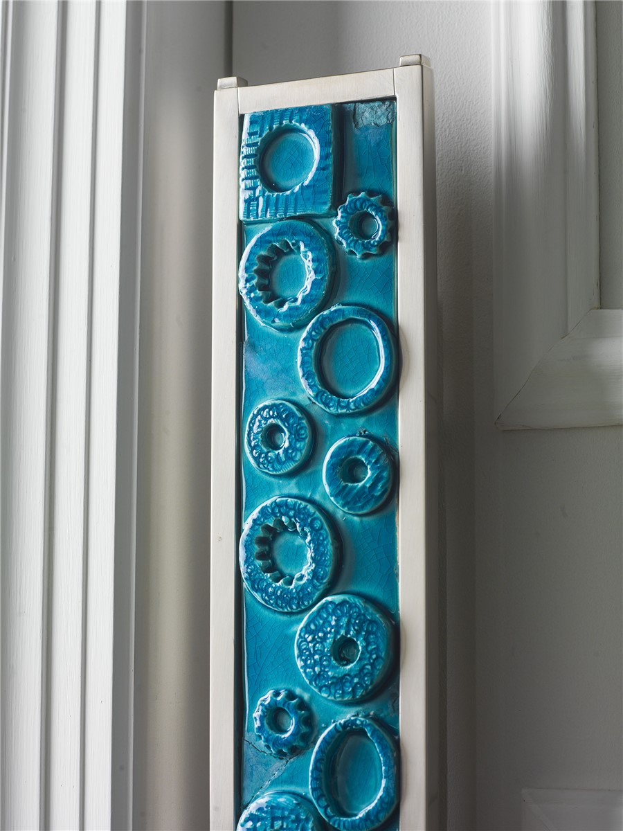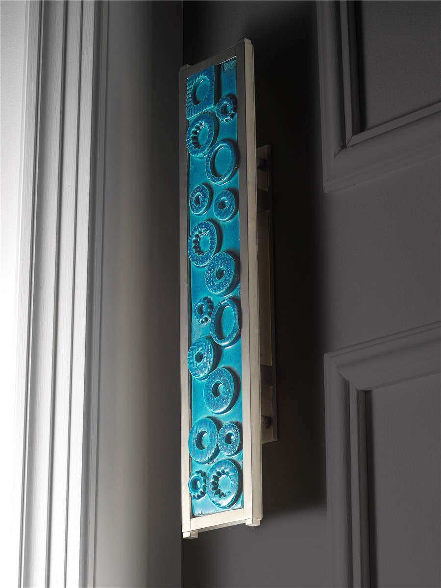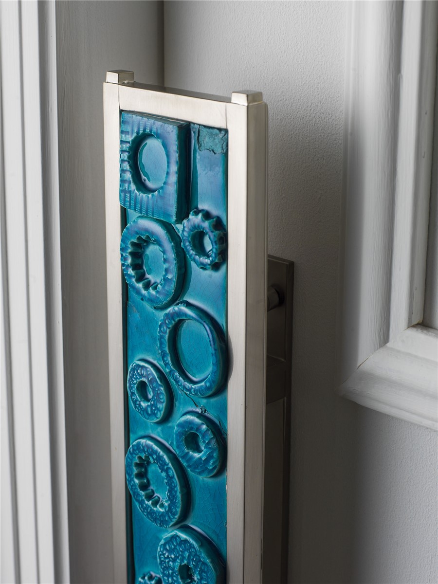 Brass handle in brushed nickel. Central part in majolica hand engraved and glazed.