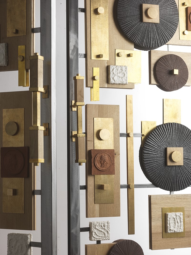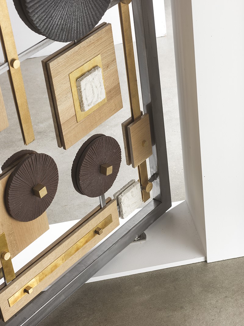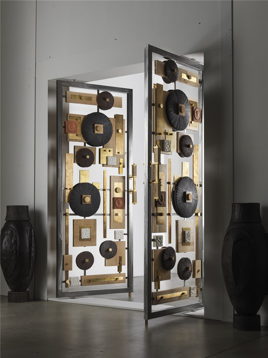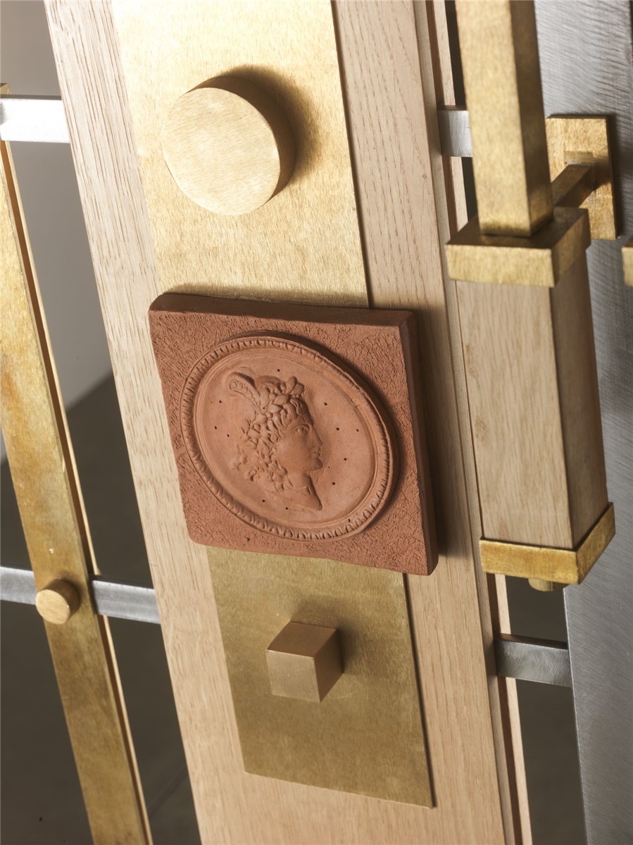 Portal consisting of a steel structure. Above the structure is applied details as decorative effect structure in majolica engraved and decorated by hand, then bronze and engraved brass, and then a wood. Each door is supported by hinges for pivot doors. Suitable for dividing rooms, rooms are totally custom made for needs request.