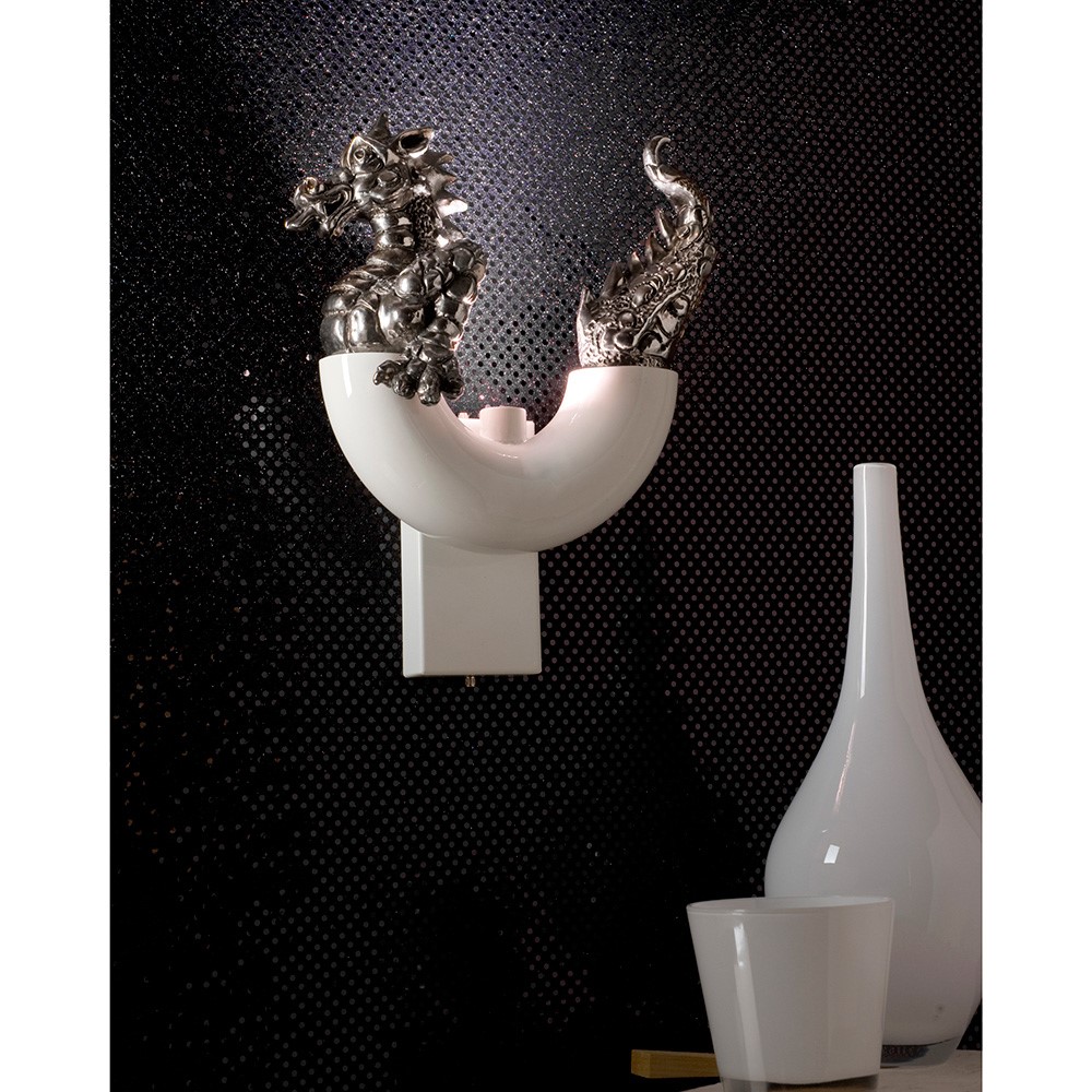 Wall lamp with lacquered iron structure. Hand engraved and platinum plated majolica dragon.