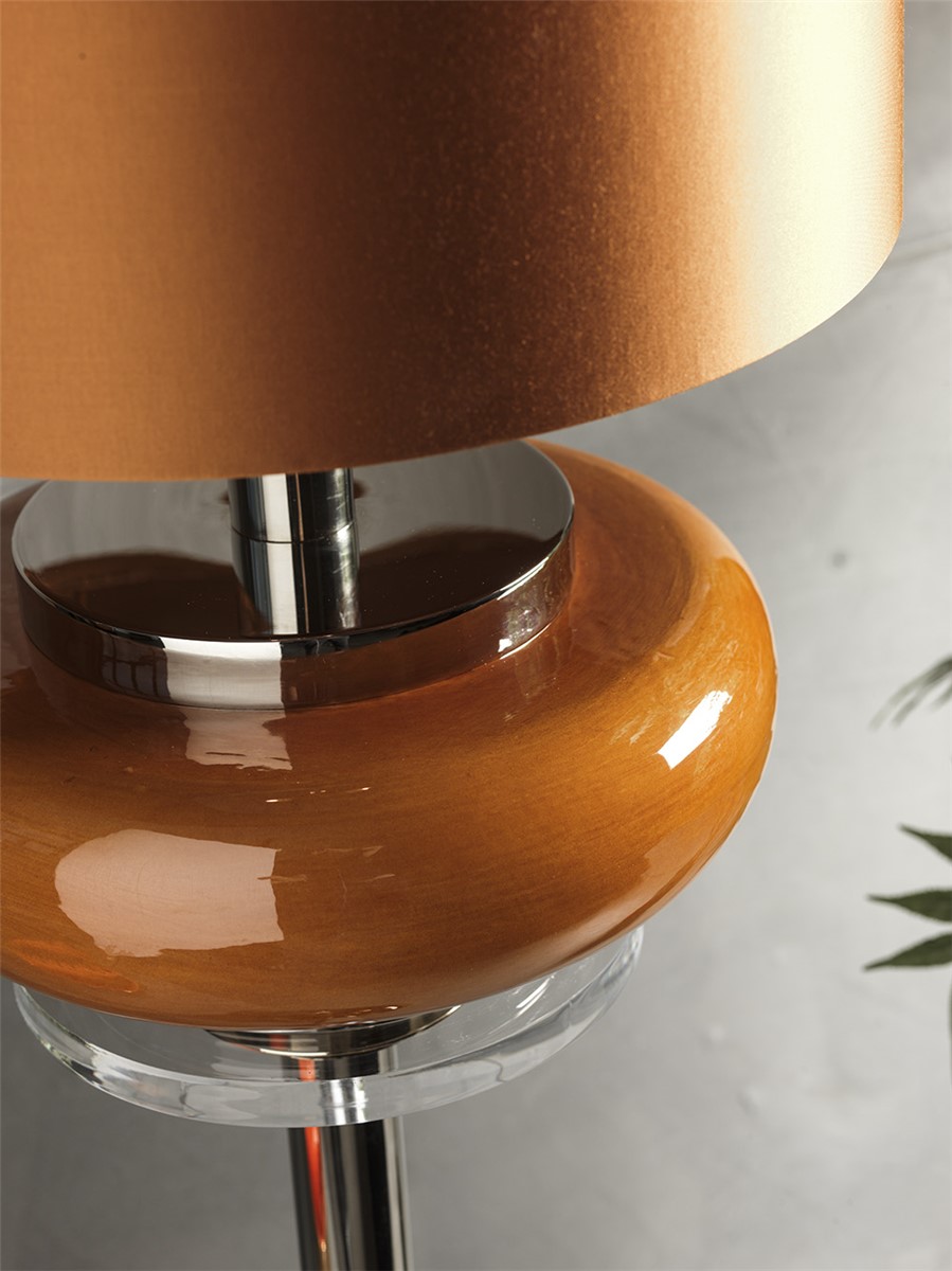 Floor lamp in gilded and nickel brass, central part in amber glazed majolica amber and Plexiglas. The lampshade is in amber silk.