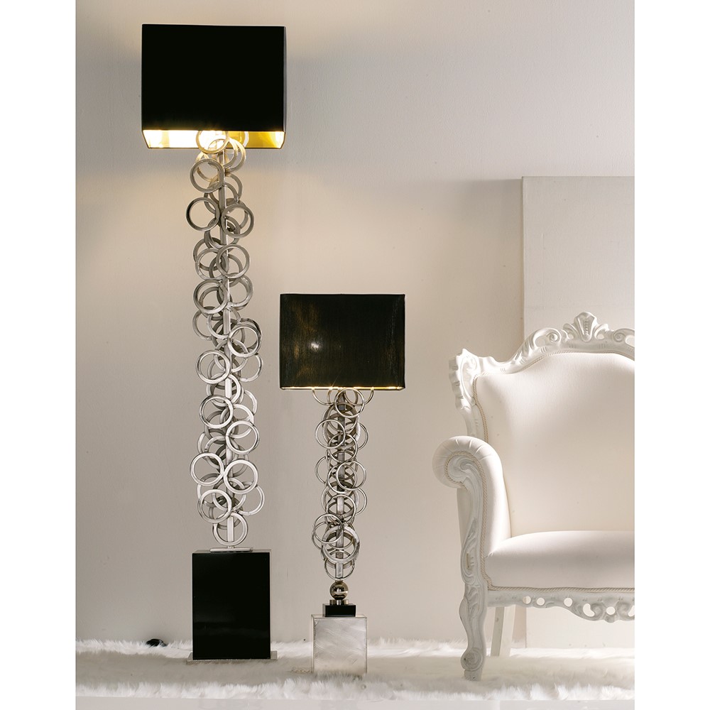 Brushed and chromed iron wall lamp. Glossy-black lacquered wooden base. Black chintz lampshade with silver coloured inside.
