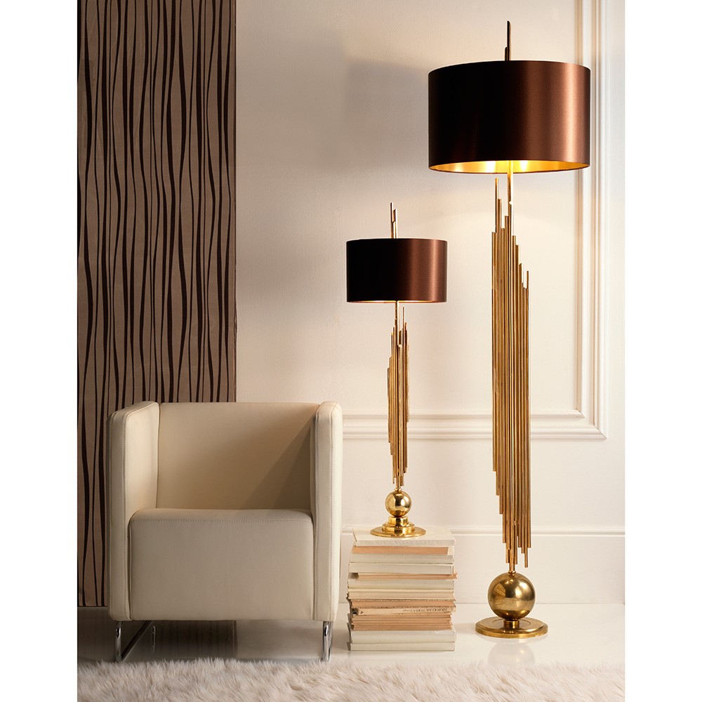 Floor lamp made of iron tubes, hand soldered and cut, gold plated. Brown silk satin lampshade with golden inside.