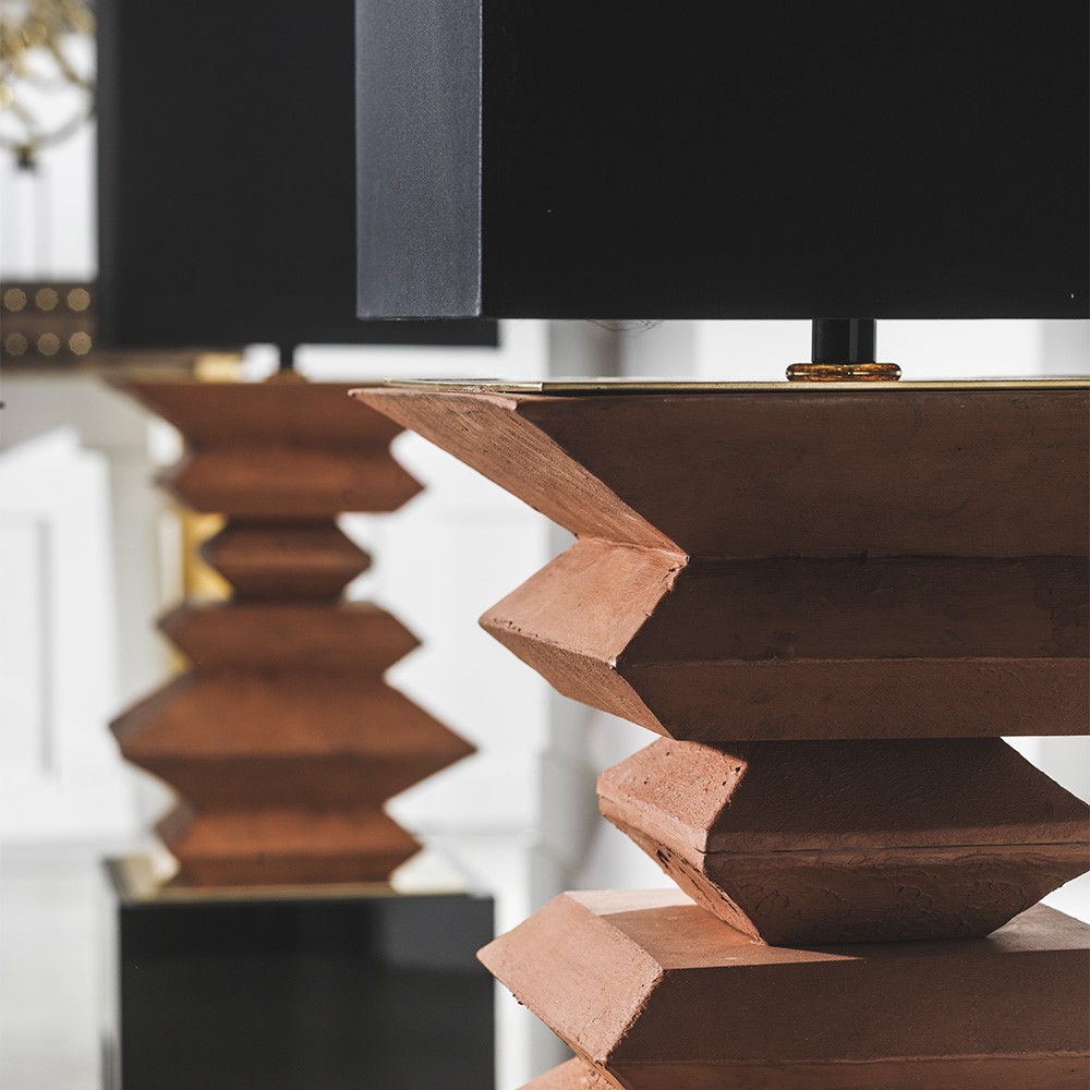 Terracotta floor lamp with glossy black lacquered wood base and natural brass details. Black shade inside gold.