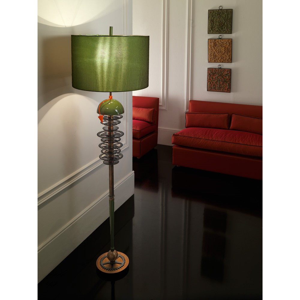 Burnished brass floor lamp with pewter gearwheels. Orange minute hand, burnished brass and green details. Green “lux” silk over green silk double lampshade.