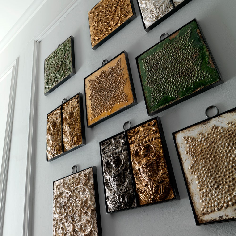 Painting with emery iron structure and panel in hand engraved majolica, off yellow glazed.