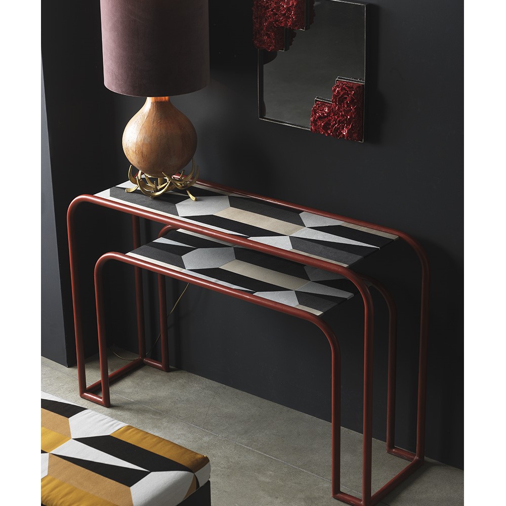 Brushed metal console in glossy lacquered red coral. Tops are covered by fabric.