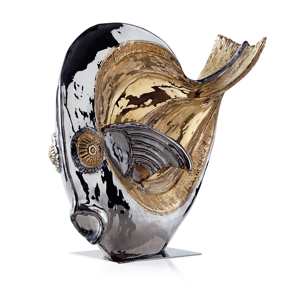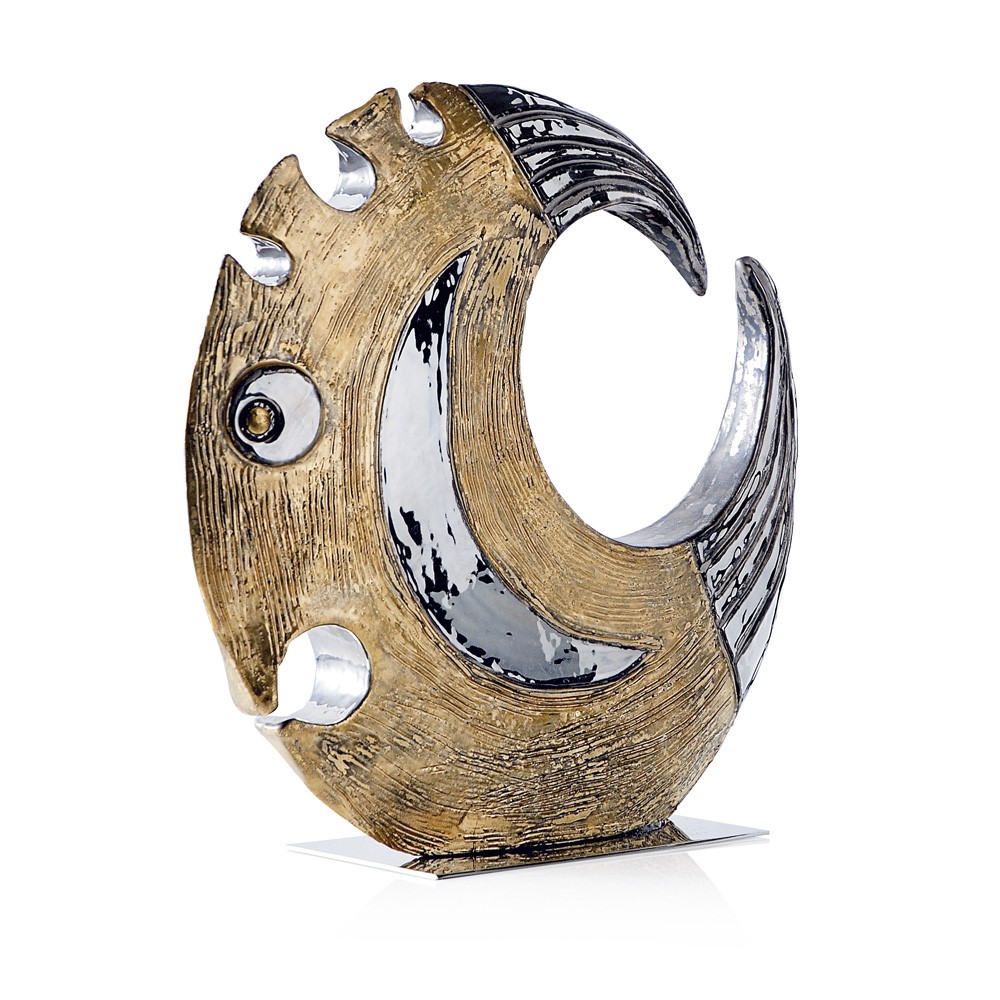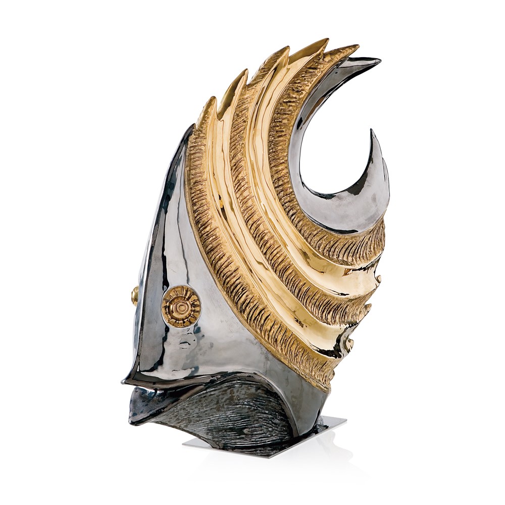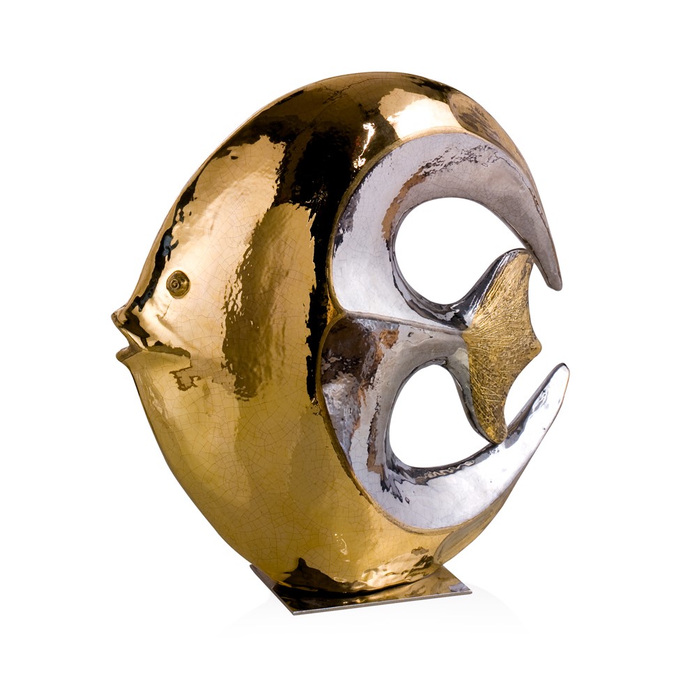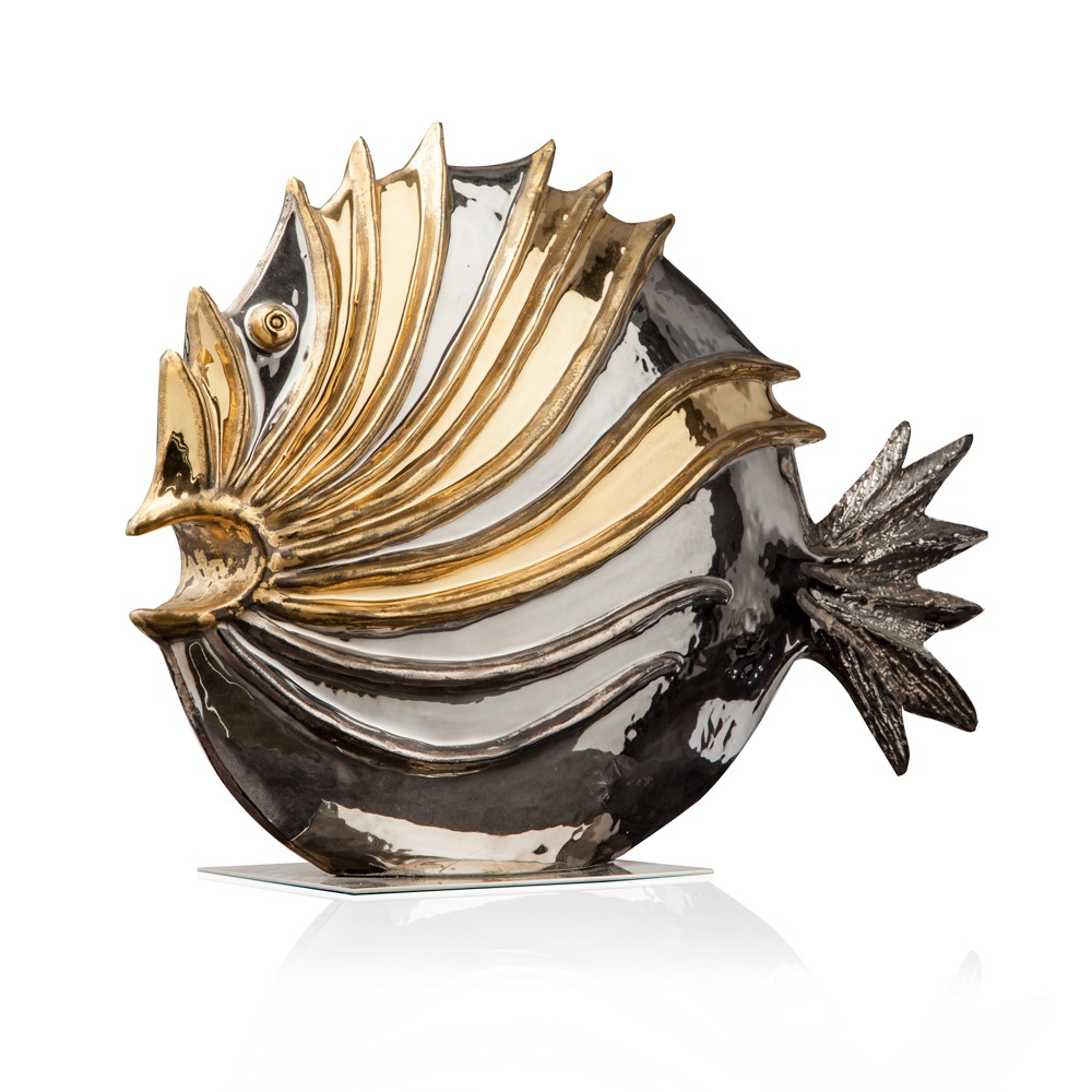 Real gold and platinum plated, hand engraved majolica fish. Chromed brass base.