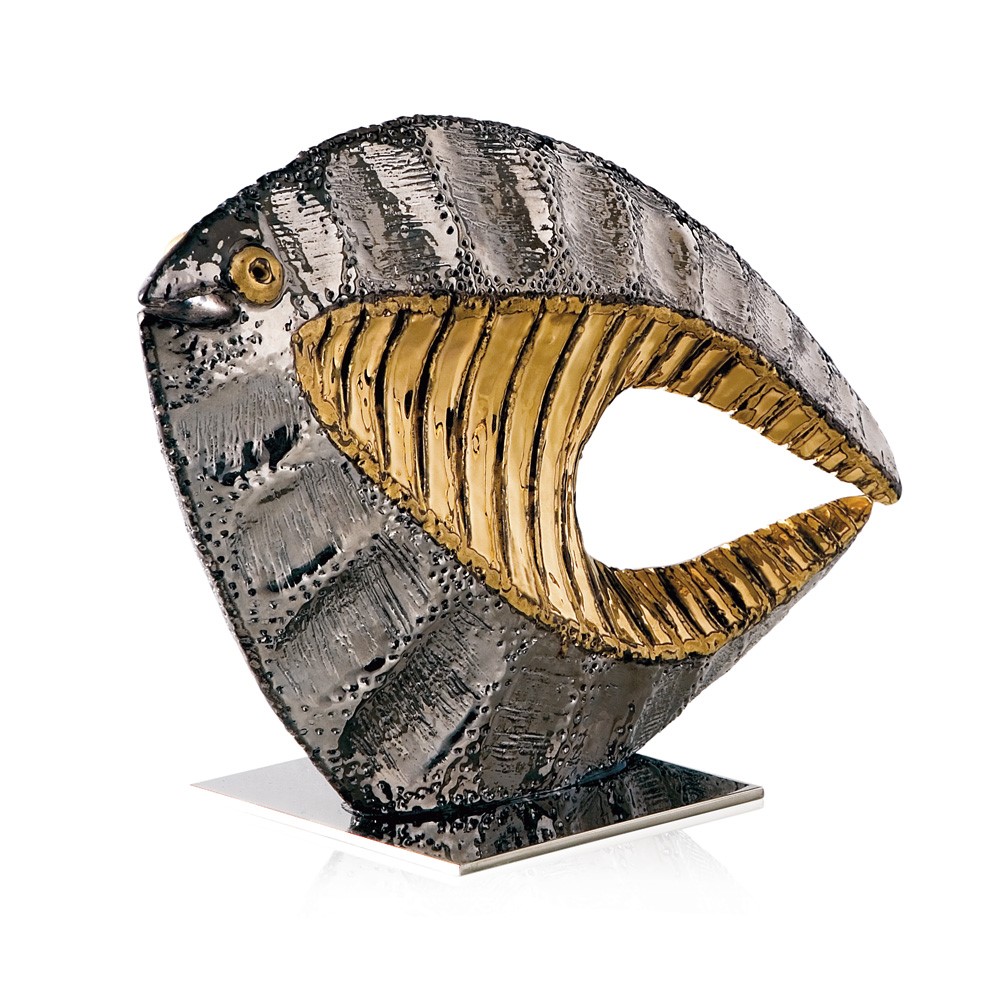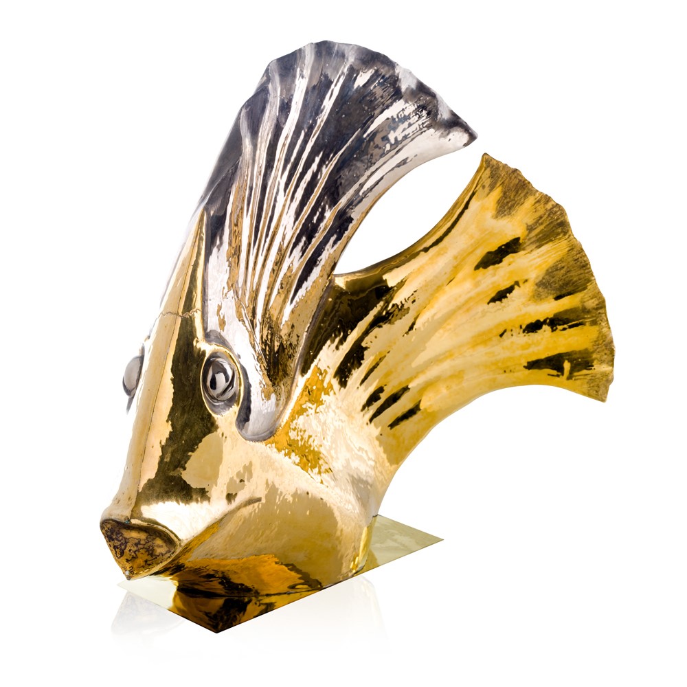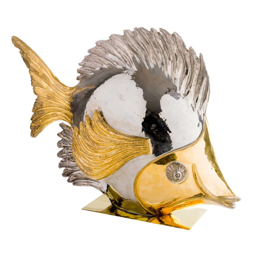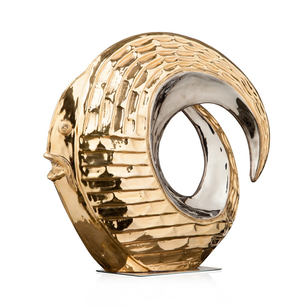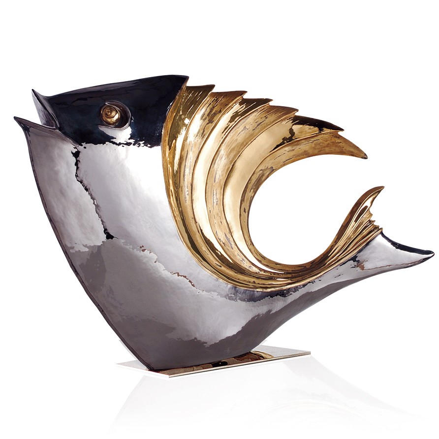 Real gold and platinum plated, hand engraved majolica fish. Chromed brass base.