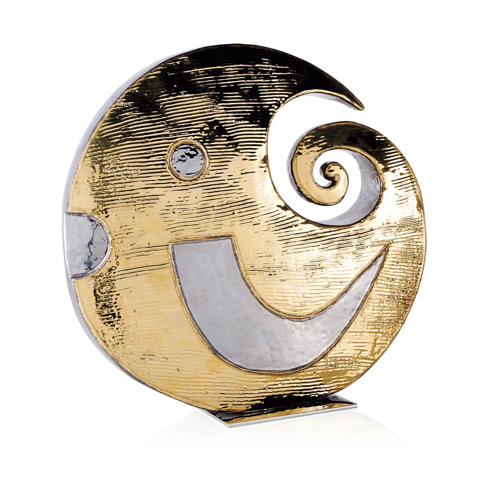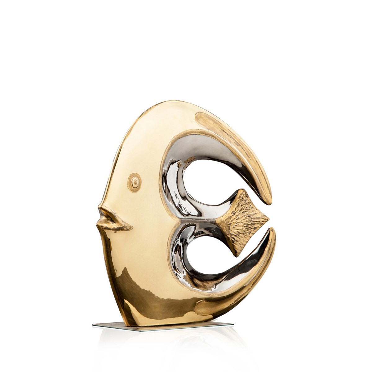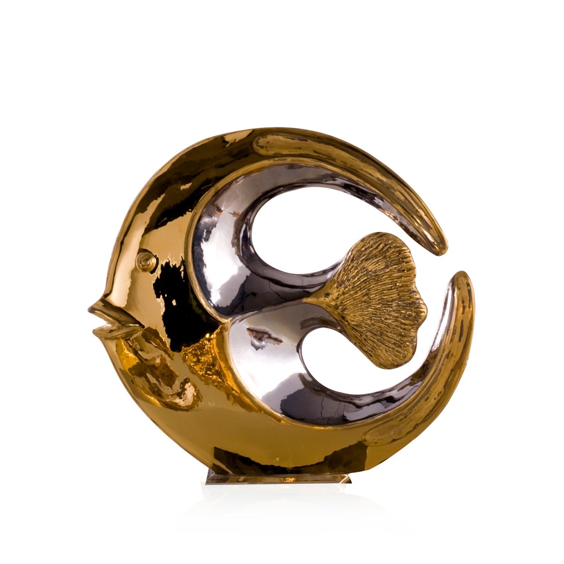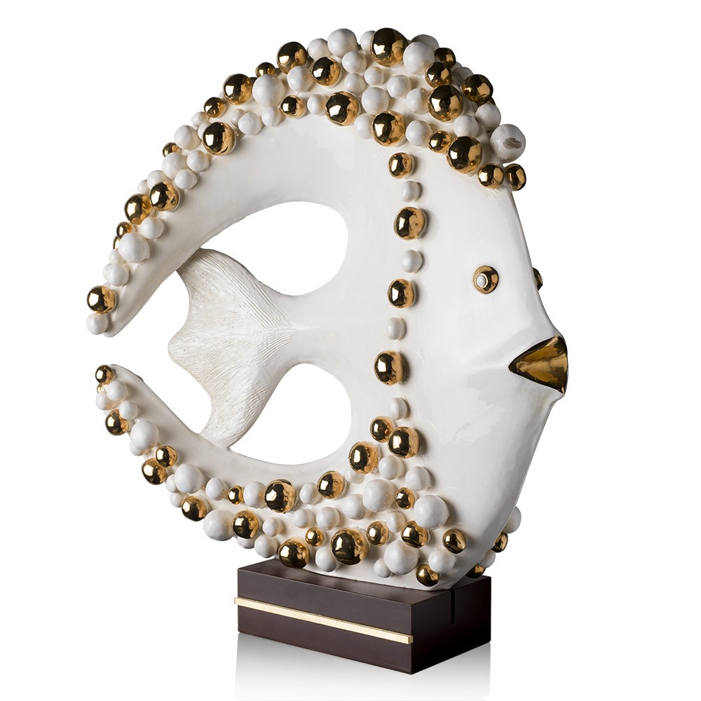 Real gold and platinum plated, hand engraved majolica fish. Chromed brass base.