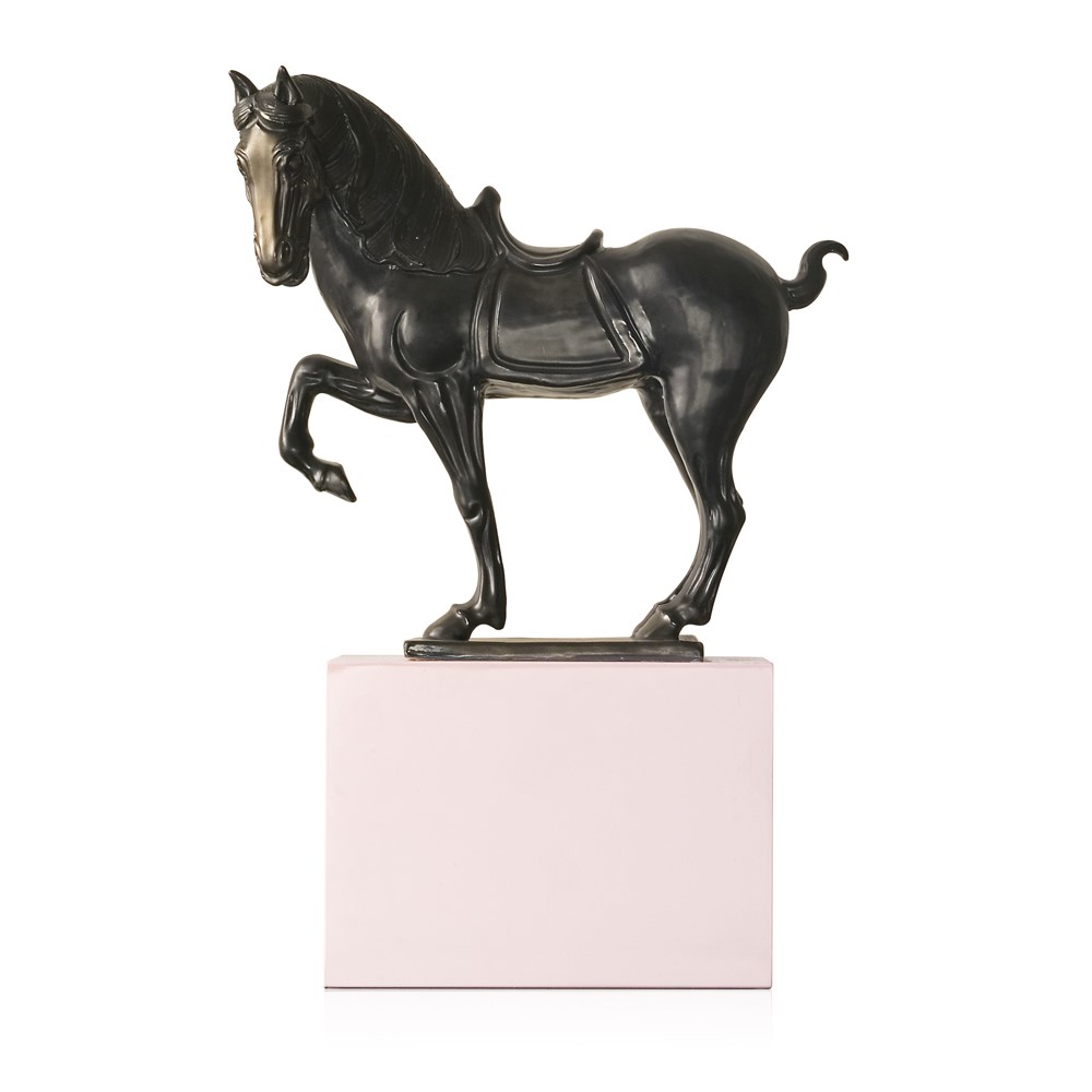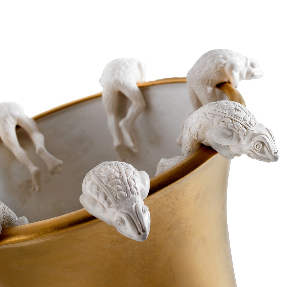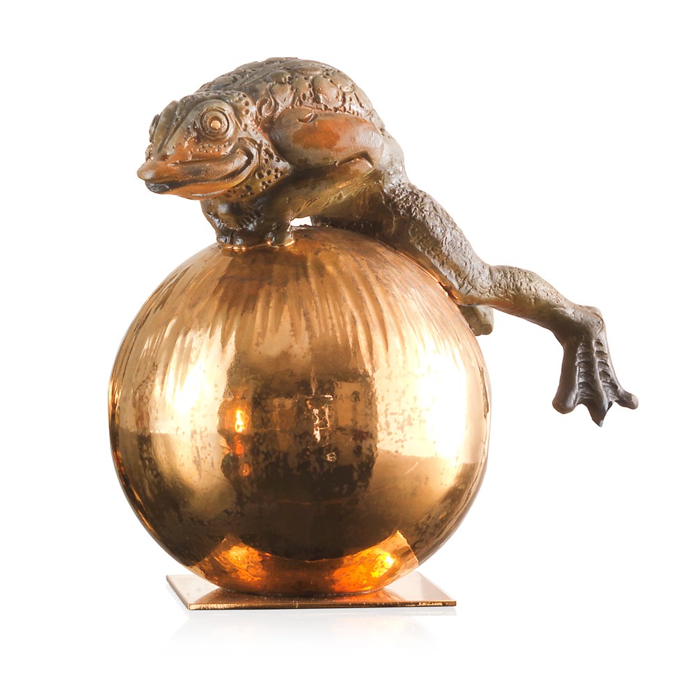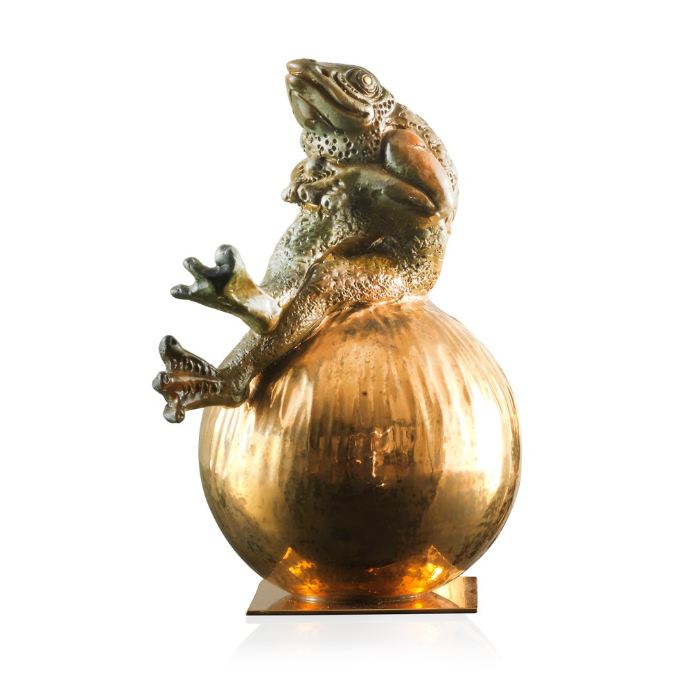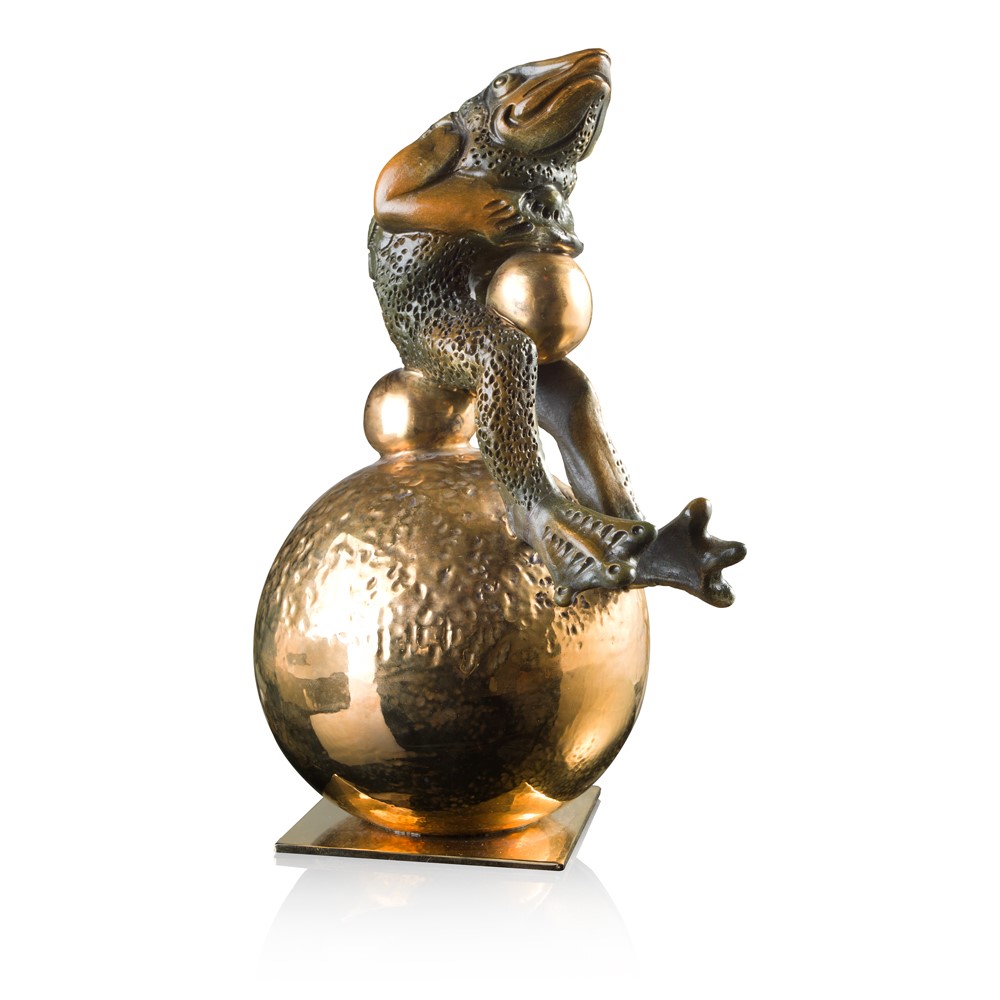 Real gold and platinum plated, hand engraved majolica fish. Chromed brass base.