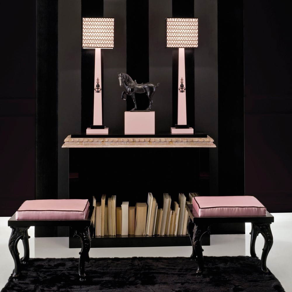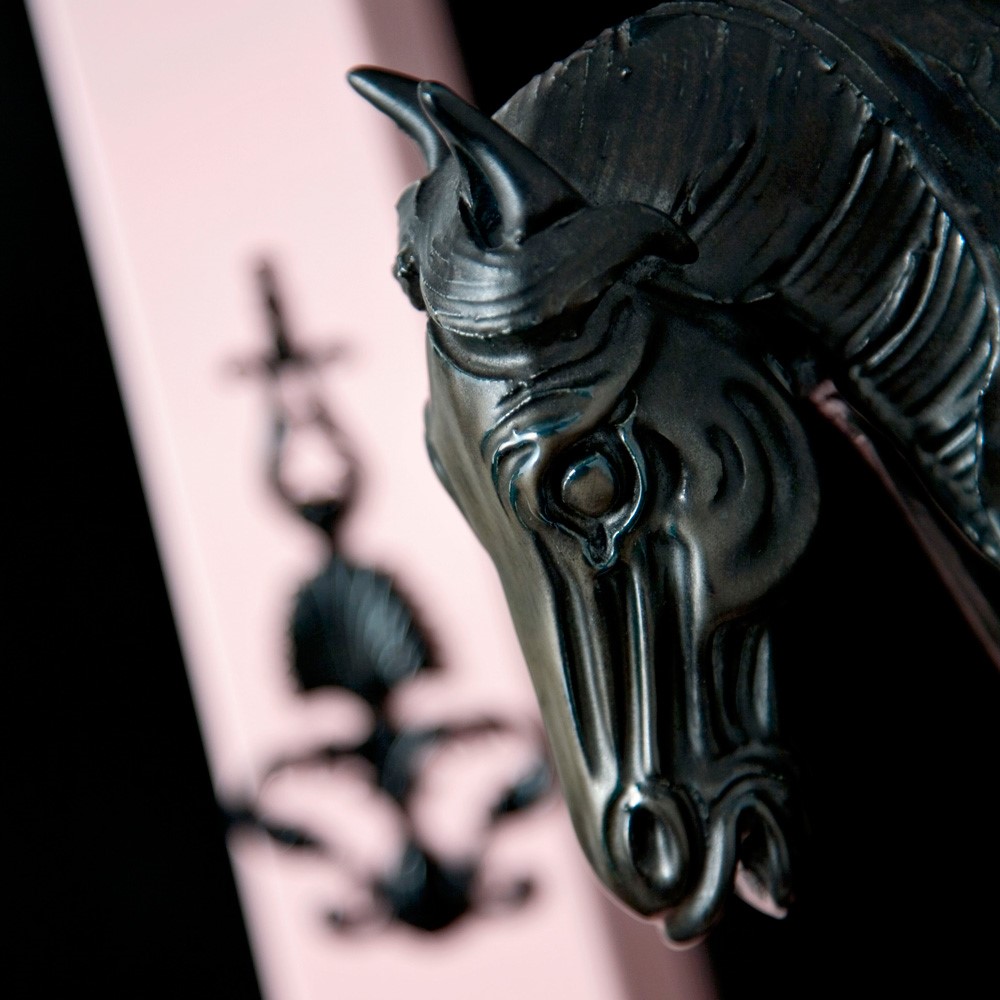 Hand engraved and decorated majolica horse, with pink lacquered wooden base.