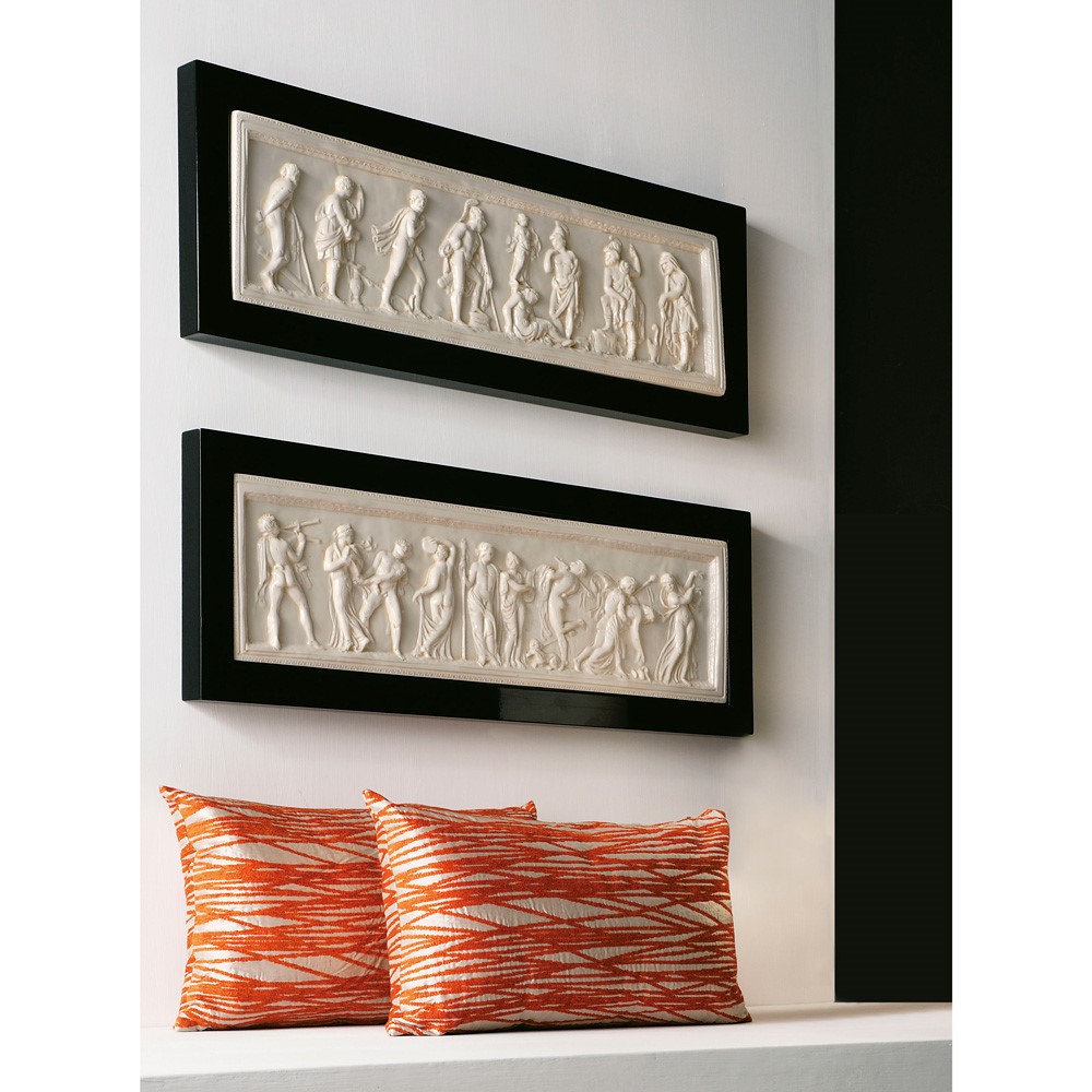 Hand engraved and glazed majolica picture. Glossy-black lacquered wooden frame.