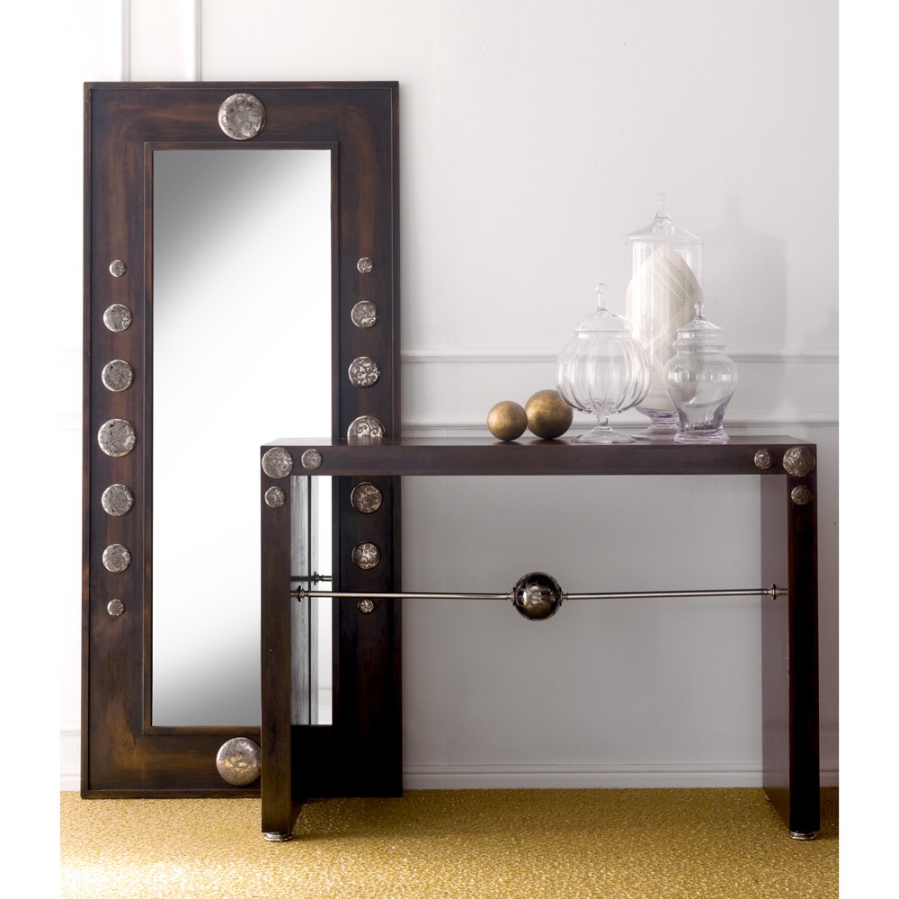 HISTORICAL ITEM OUT OF PRODUCTION - Wooden console, brown/black lacquered. Platinum plated and chromed brass majolica details.