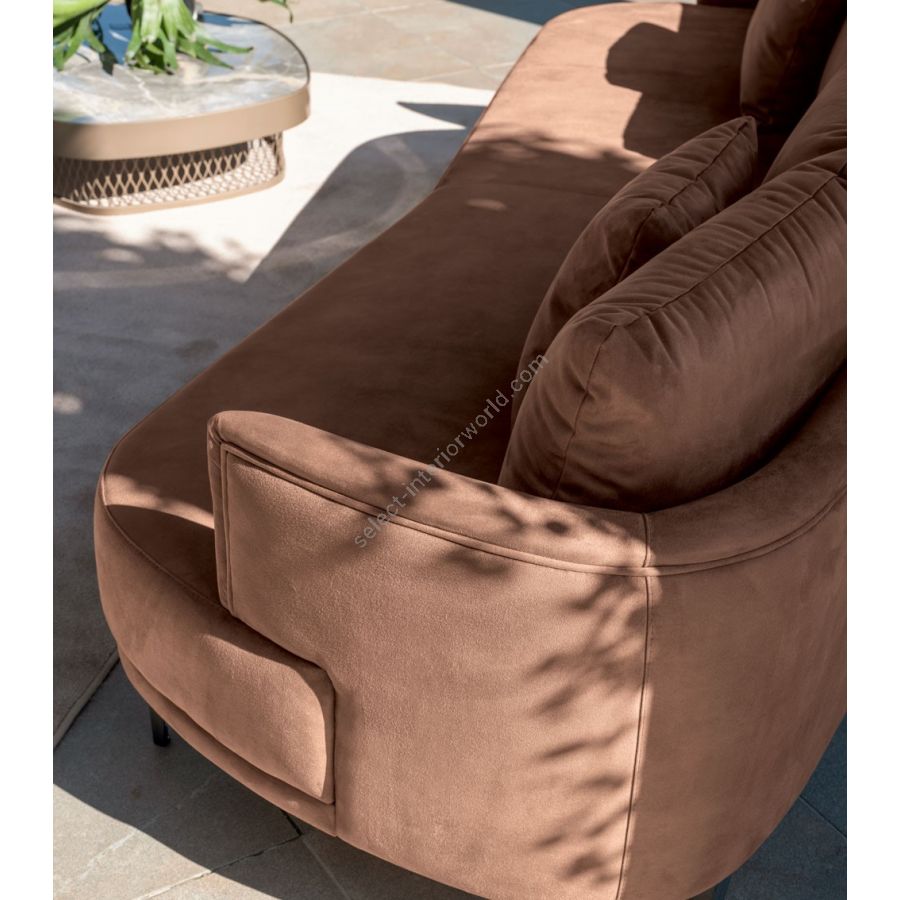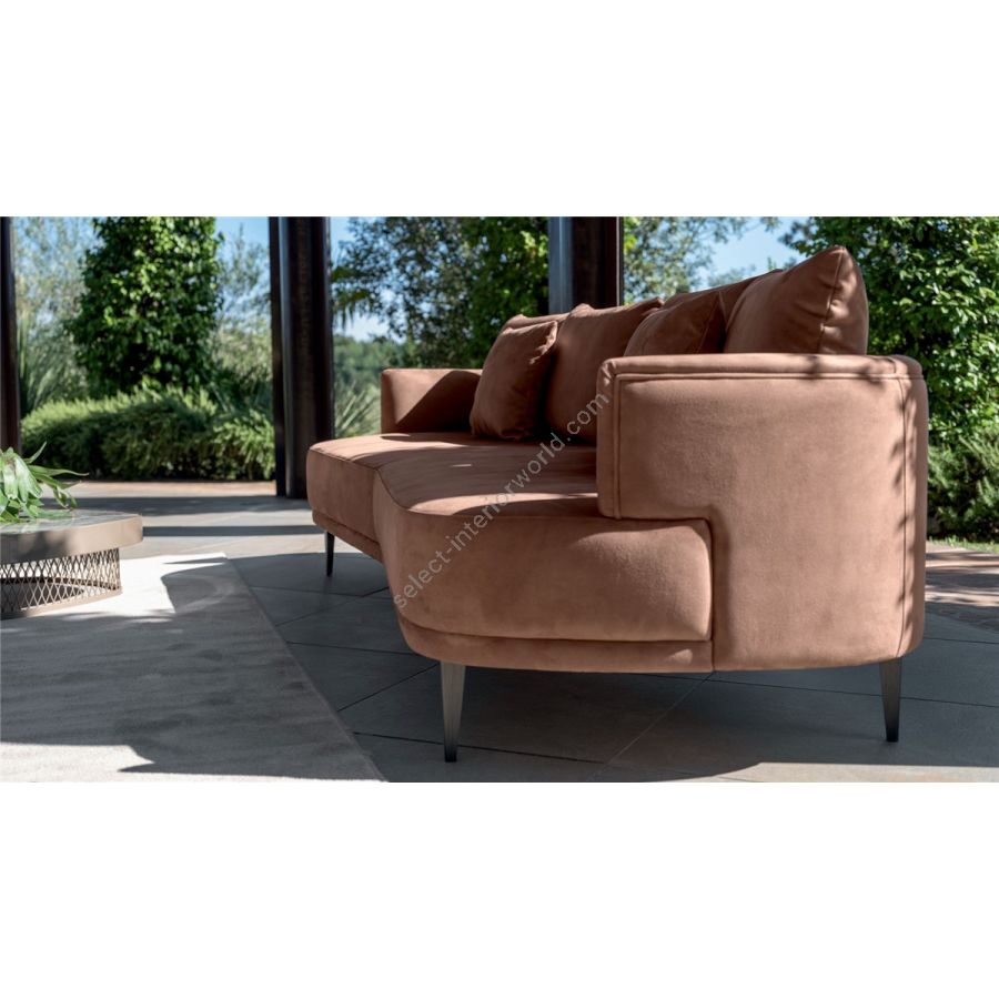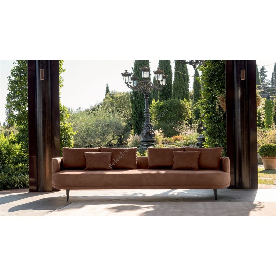 Sofa frame in shaped poplar plywood and suspension with elastic straps. Padding in polyurethane foam with different densities. Cushioning with feather douvet. Upholstery in fabric, leather, eco-leather. Iron legs