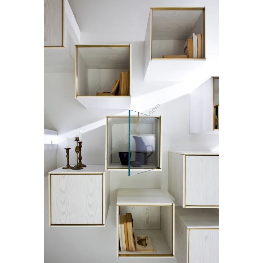 Modular unit system with structure in plain, dyed, lacquered or aniline-dyed veneered wood and profiles with satin brass finish.