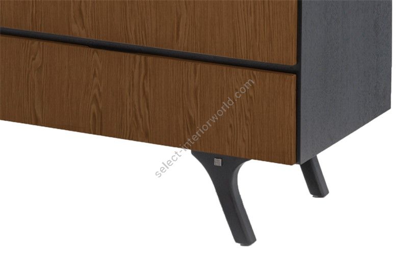 Comfortable, versatile, modern and light weight. A wonderful reinterpretation of the style from the sixties. Latte Wood drawer fronts, from the six drawers, the upper ones include the characteristic hardware from this collection; three well produced leather pads in its base and a sculptural form with small legs that make you think it is floating in space.