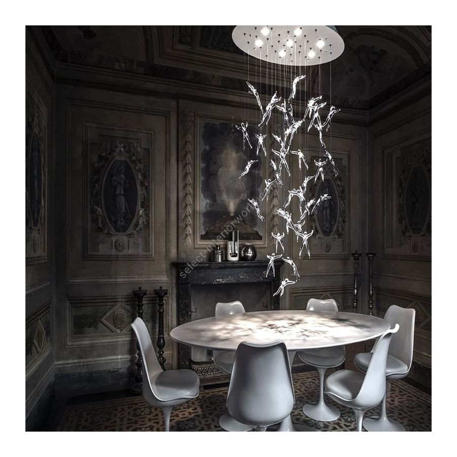 For his latest work for Terzani, Nigel Coates, well known for his unorthodox approach to design, has created an engaging, unique light. Customizable groups of hand made crystal (24% lead) “angels” are illuminated by halogen or led lamps. What caused these angels to fall from the heavens? It’s up to the viewers to decide. Either way, Angel Falls is sure to garner attention, and generate conversation, in any setting.