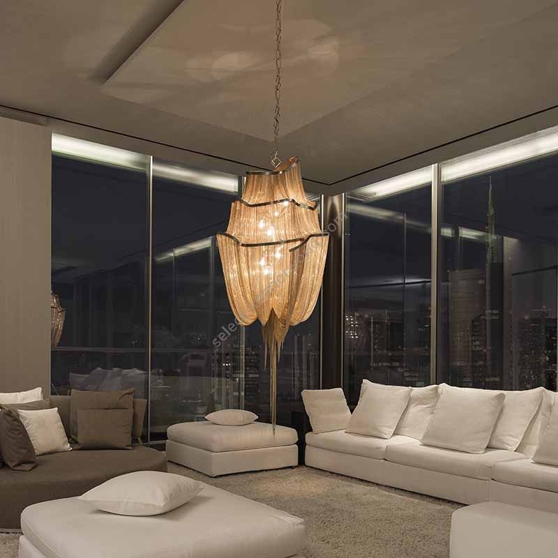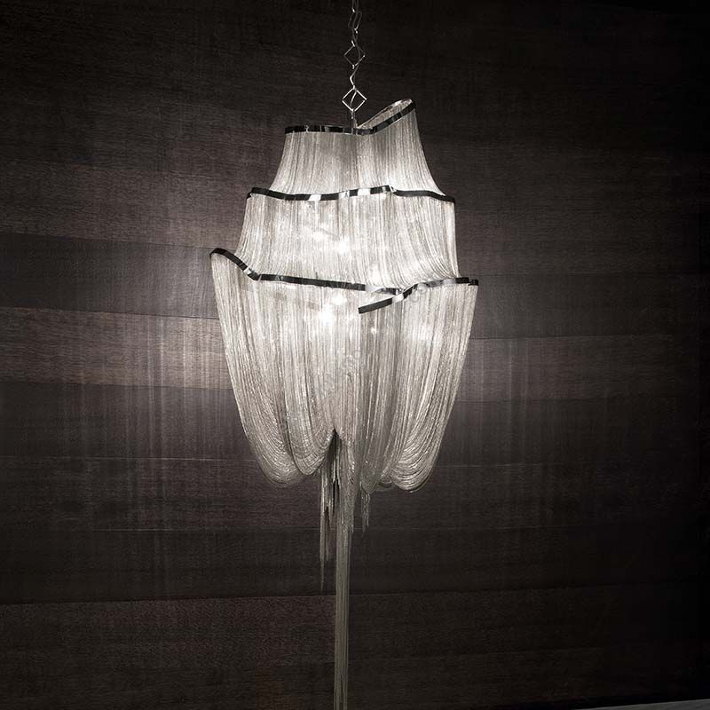 Seemingly alive, atlantis’ shimmering light creates a vibrant source of energy. Its mesmerizing, organic effect is created by hundreds of illuminated lengths of draped, nickel chain. Like water in the ocean, atlantis’ chains appear liquid, cascading over its gloss nickel bands and falling down towards the abyss before turning back into itself. Atlantis is composed of almost three miles of chain, meticulously hand-crafted by master italian artisans.
