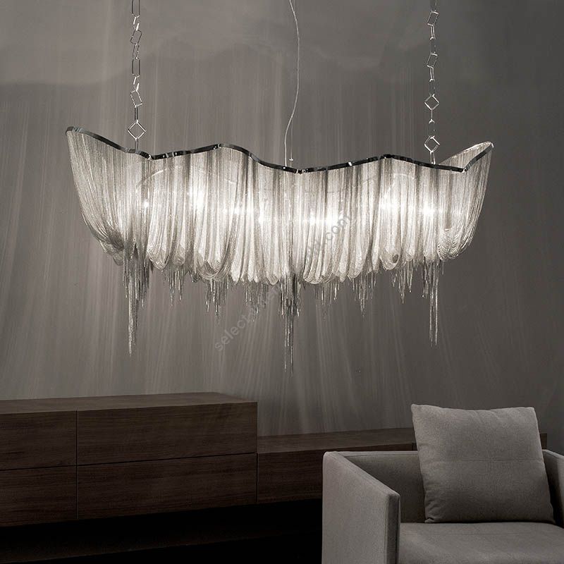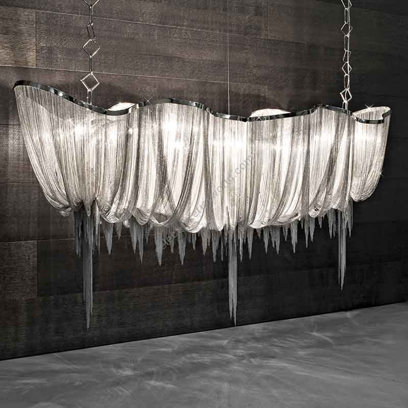 Seemingly alive, Atlantis’ shimmering light creates a vibrant source of energy. Its mesmerizing, organic effect is created by hundreds of illuminated lengths of draped, nickel chain. Like water in the ocean, Atlantis’ chains appear liquid, cascading over its gloss nickel bands and falling down towards the abyss before turning back into itself. Atlantis is composed of almost three miles of chain, meticulously hand-crafted by master italian artisans.