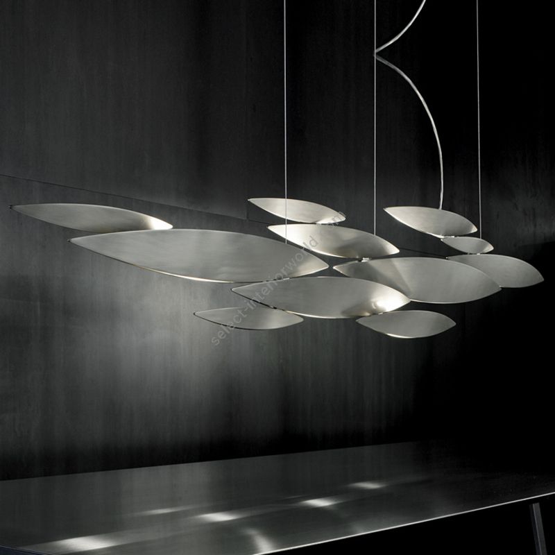 I Lucci Argentati draws from nature to create a whimsical, yet modern light. Recalling a school of fish darting through freshwater, it creates a mesmerizing luminescence. Sets of 22 sleek lights combine to form a stunning pendant with thin incisions along the bottom creating an understated, tranquil beauty. Thanks to its modular system, I Lucci Argentati is customizable and can be combined in many different configurations: from small to extra large; as a pendant or sconce; and finished either in brushed nickel, white and brushed gold.