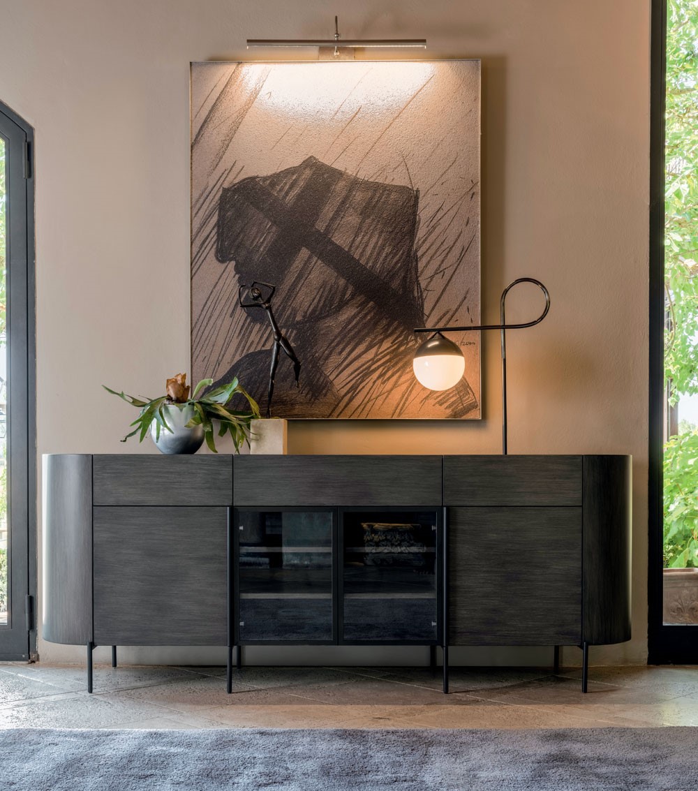 Wooden sideboard with four doors and three drawers with a simple, contemporary design. The style of the contemporary structure emphasises linearity and the detail of elegance. The metal base, colour-matched to the legs, supports the structure, giving it a light and comfortable appearance.