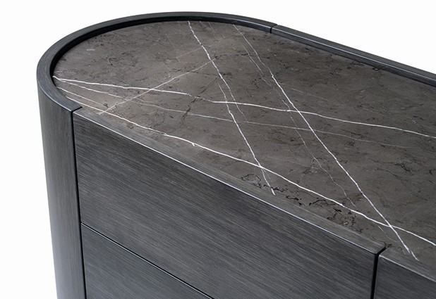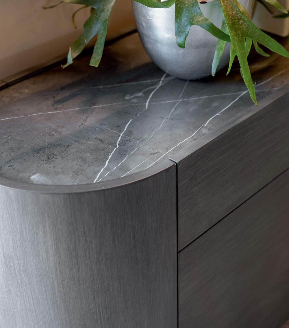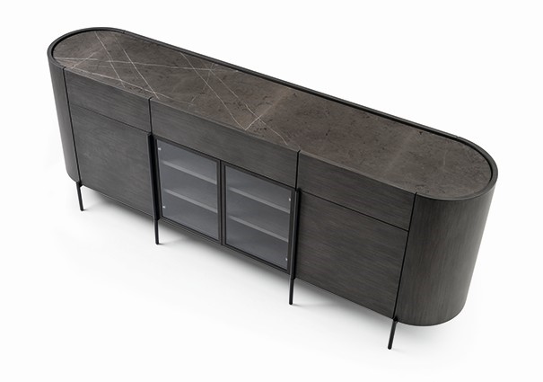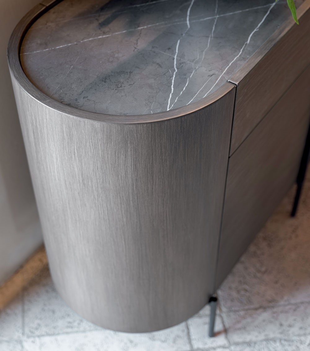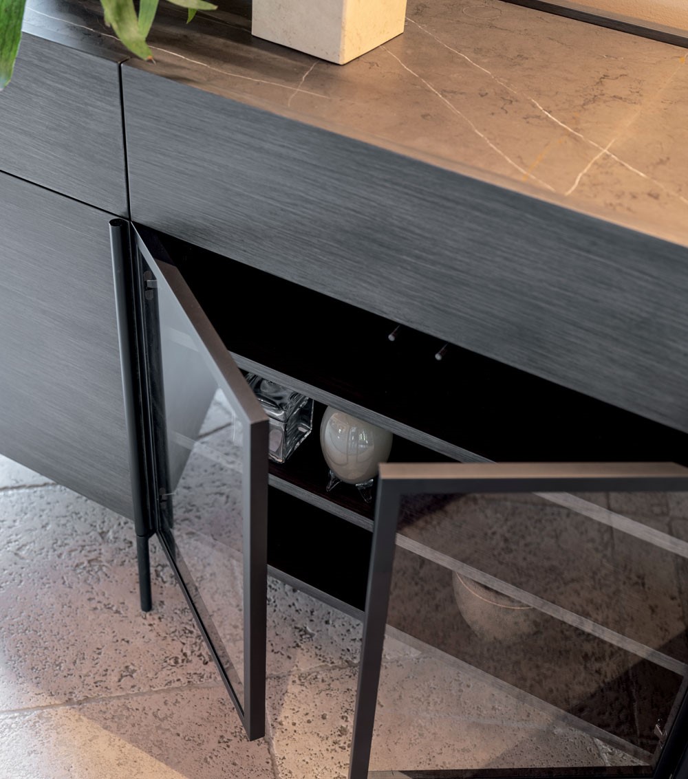 | Structure and fronts in poplar blockboard. Curved sides in multilayer MDF and lacquered. Drawers with metal rails. Central glass doors with aluminium frame. Cushioned hinges. Countertop in wood, marble or stoneware. Iron base and handles in cylindrical section. | |