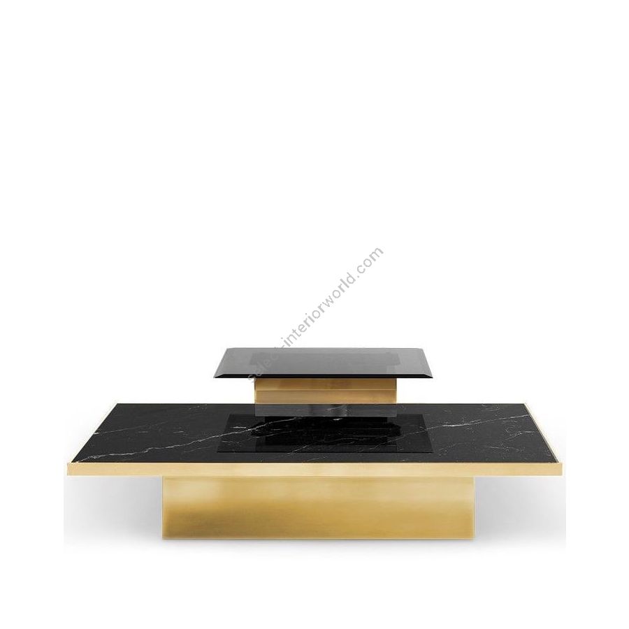 The Thor Center Table is a stately luxury design expertly crafted with Nero Marquina marble, black lacquer, polished brass, and a smoked mirror top. This impactful black center table was meticulously designed to command attention and become the focal point of any living room.