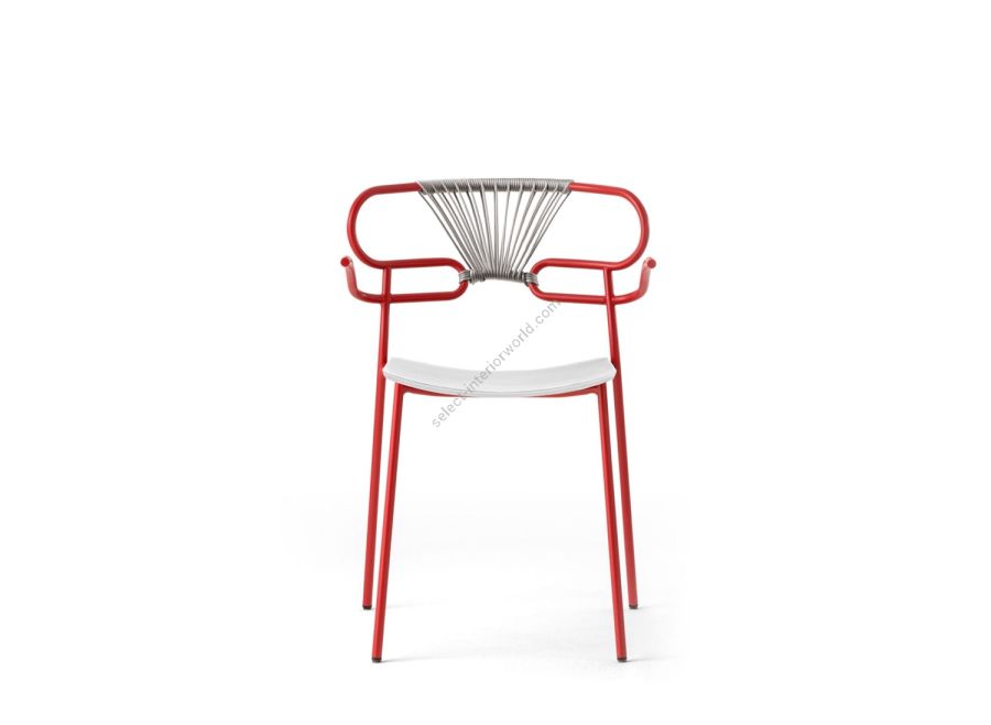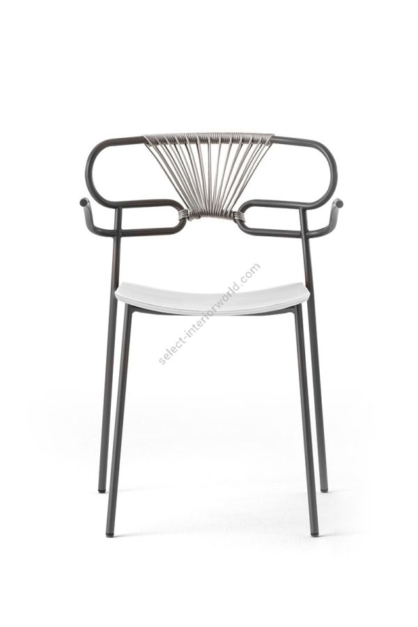 | Description: | Stackable structure with armrests in painted metal or in polished chrome, bright black chrome, polished brass, seat in ash, back with colored rope weaving. |