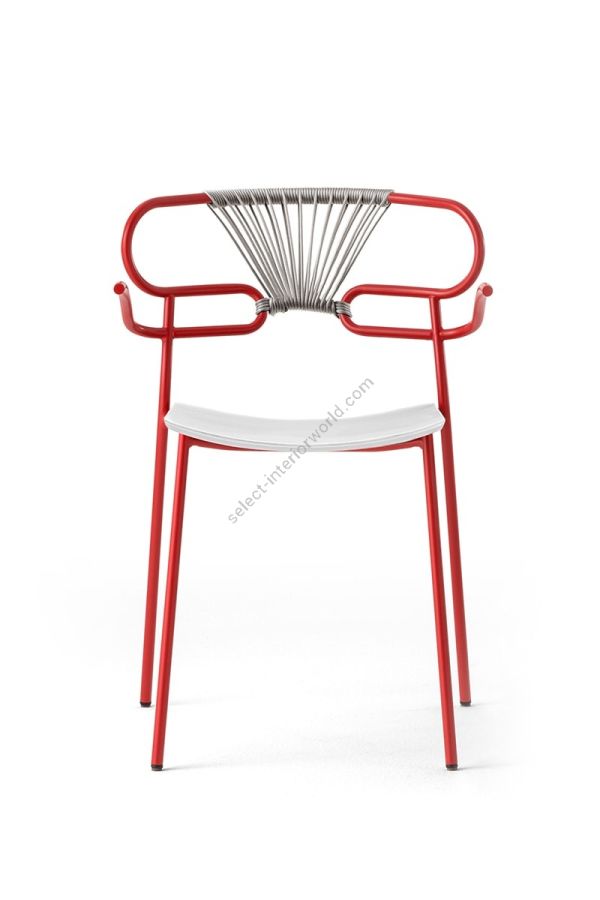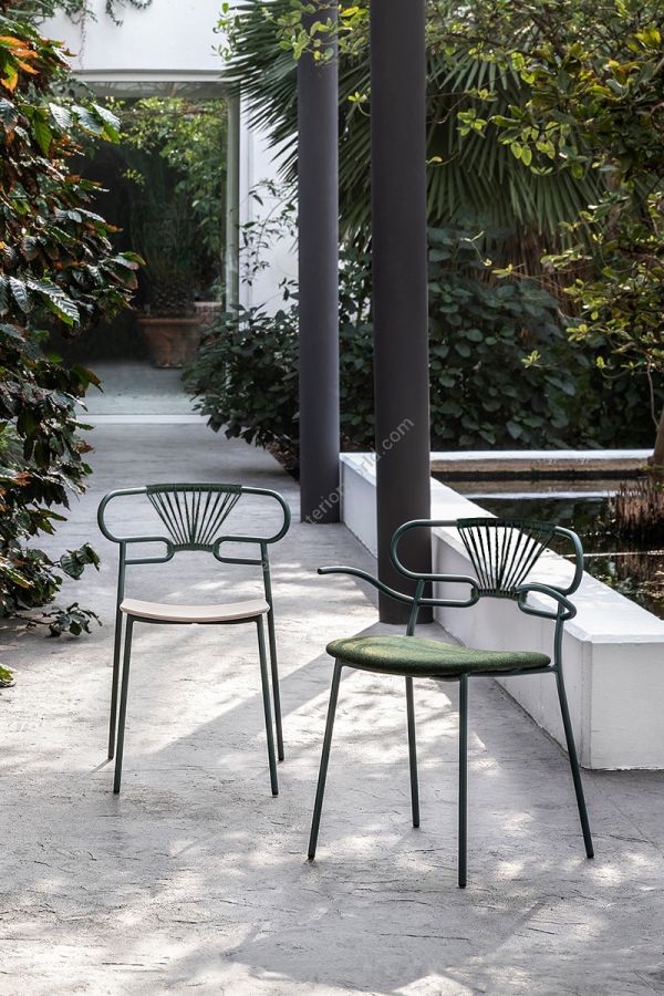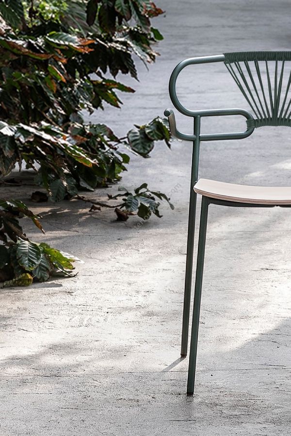 The Genoa chair collection, by talented young designer Cesare Ehr, featuring a stool and a chair with armrests, is also available in an outdoor version. The distinguishing element is the ‘one-line’ backrest, obtained by curving a single metal tube which - with its virtually endless wavy line, also extended to the armrests in this new version - is an elegant addition to every space, bringing a sense of lightness.The outdoor version of the chair will be presented at Salone del Mobile 2019. With integral body in polyurethane, mass painted in the mould, it is also available with a woven backrest in coloured rope to enhance both its look and the level of comfort provided.The frame in powder-coated tubular metal comes in a wide variety of colours; the slightly curved seat - for the indoor versions - is in ash wood (left au naturel or painted) or upholstered with various fabrics, leather or eco-leather.