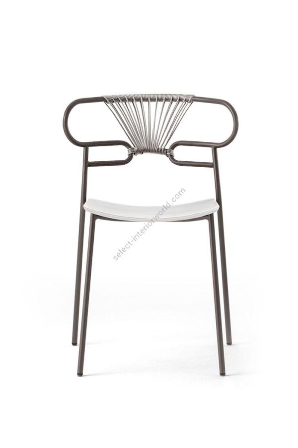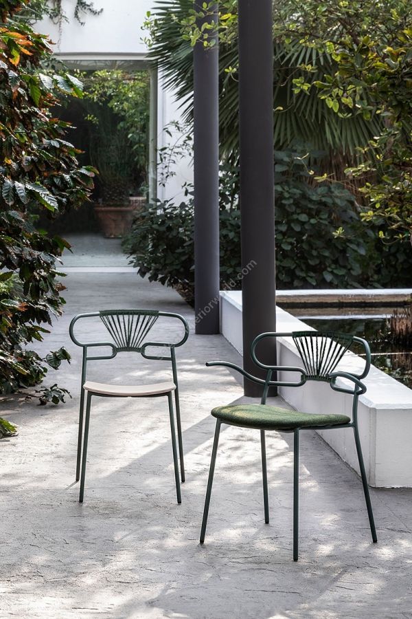 The Genoa chair collection, by talented young designer Cesare Ehr, featuring a stool and a chair with armrests, is also available in an outdoor version. The distinguishing element is the ‘one-line’ backrest, obtained by curving a single metal tube which - with its virtually endless wavy line, also extended to the armrests in this new version - is an elegant addition to every space, bringing a sense of lightness.The outdoor version of the chair will be presented at Salone del Mobile 2019. With integral body in polyurethane, mass painted in the mould, it is also available with a woven backrest in coloured rope to enhance both its look and the level of comfort provided.The frame in powder-coated tubular metal comes in a wide variety of colours; the slightly curved seat - for the indoor versions - is in ash wood (left au naturel or painted) or upholstered with various fabrics, leather or eco-leather.